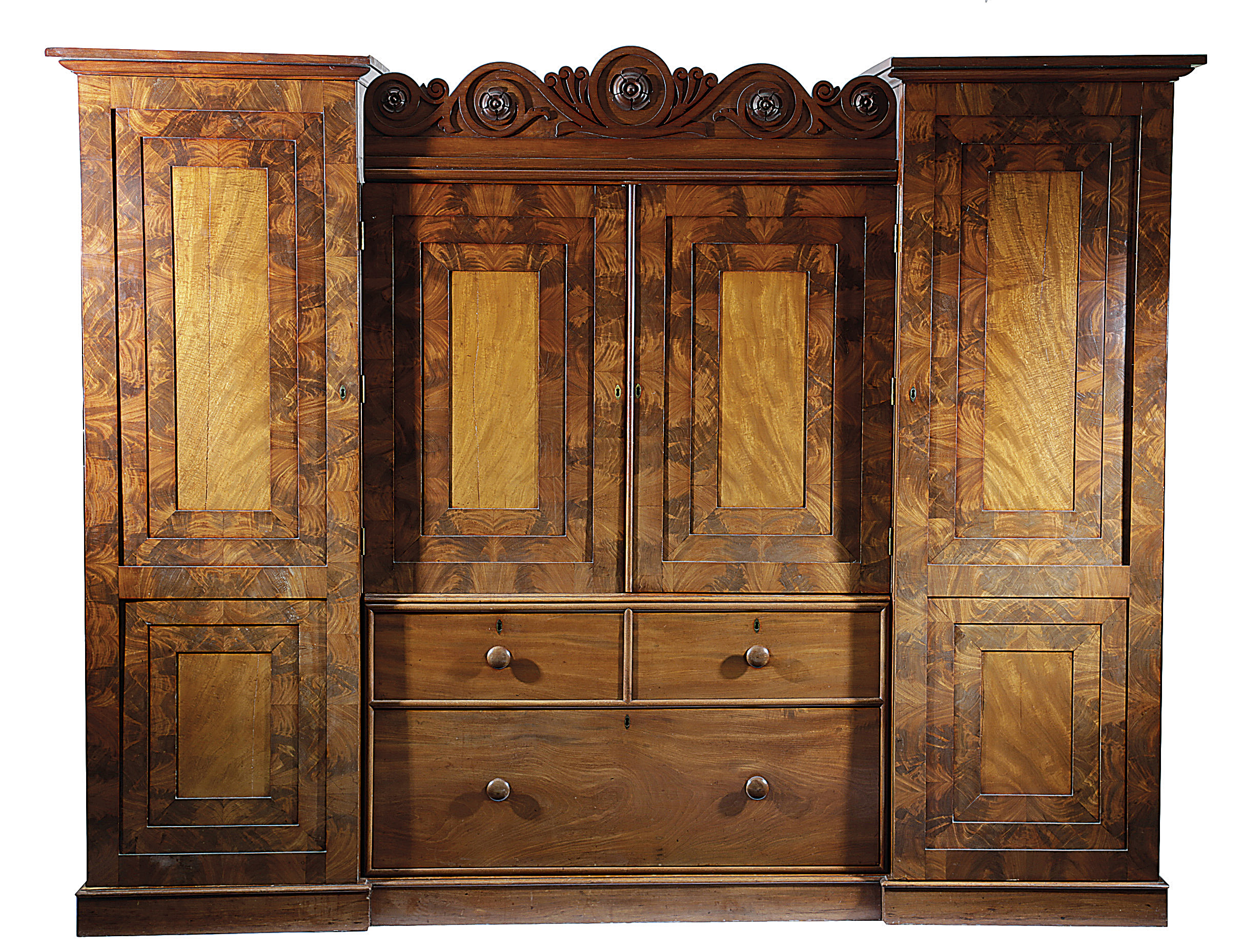 with a central scroll and rosette carved surmount, above a pair of panelled doors, enclosing a later hanging rail and two pull-out slides, above two short drawers and one long deep drawer, flanked by a pair of conforming cupboards, each fitted with a later hanging rail, brass hooks and formerly with shelves