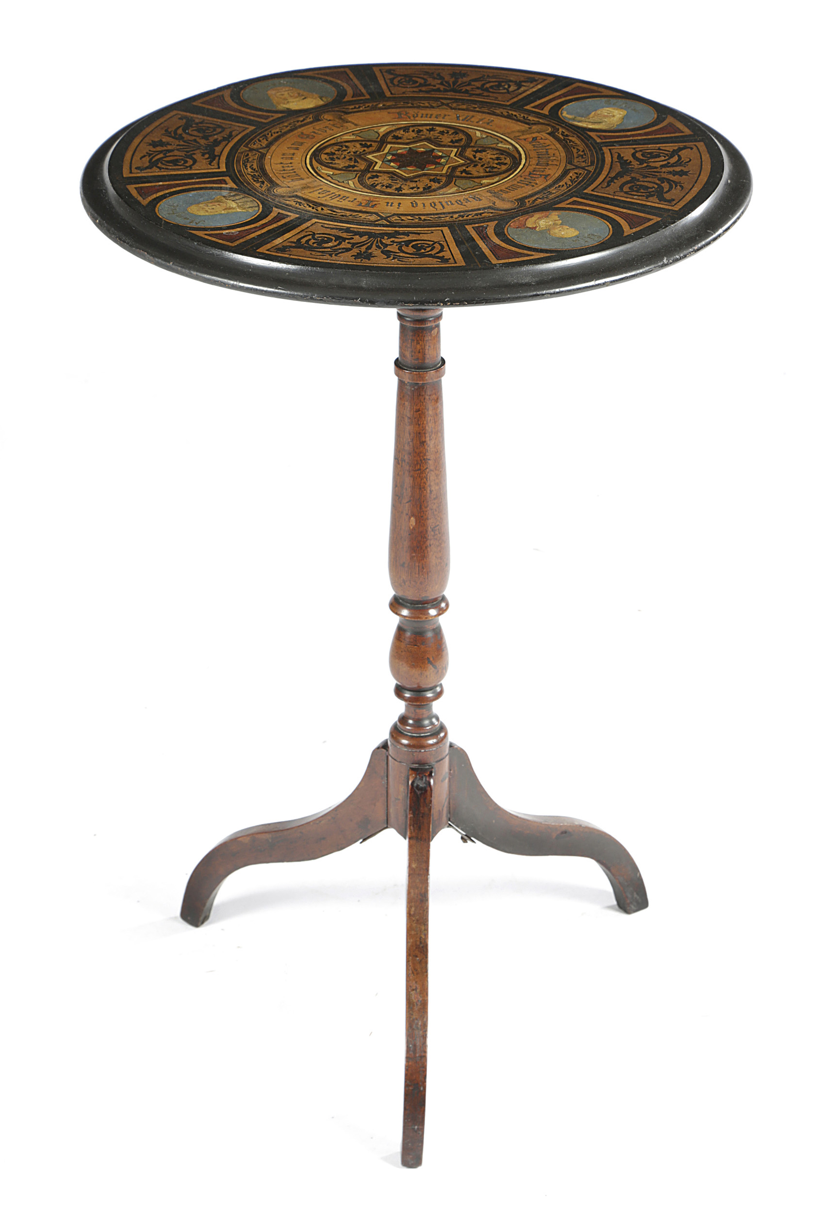 the circular ebonised and painted top decorated with four portrait miniatures of children, each named and with panels of scrolling leaves, with a German inscription and the date '1879', on an associated mahogany base