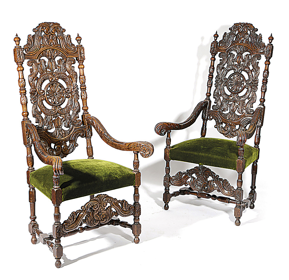 A PAIR OF CARVED OAK OPEN ARMCHAIRS IN CHARLES II STYLE
