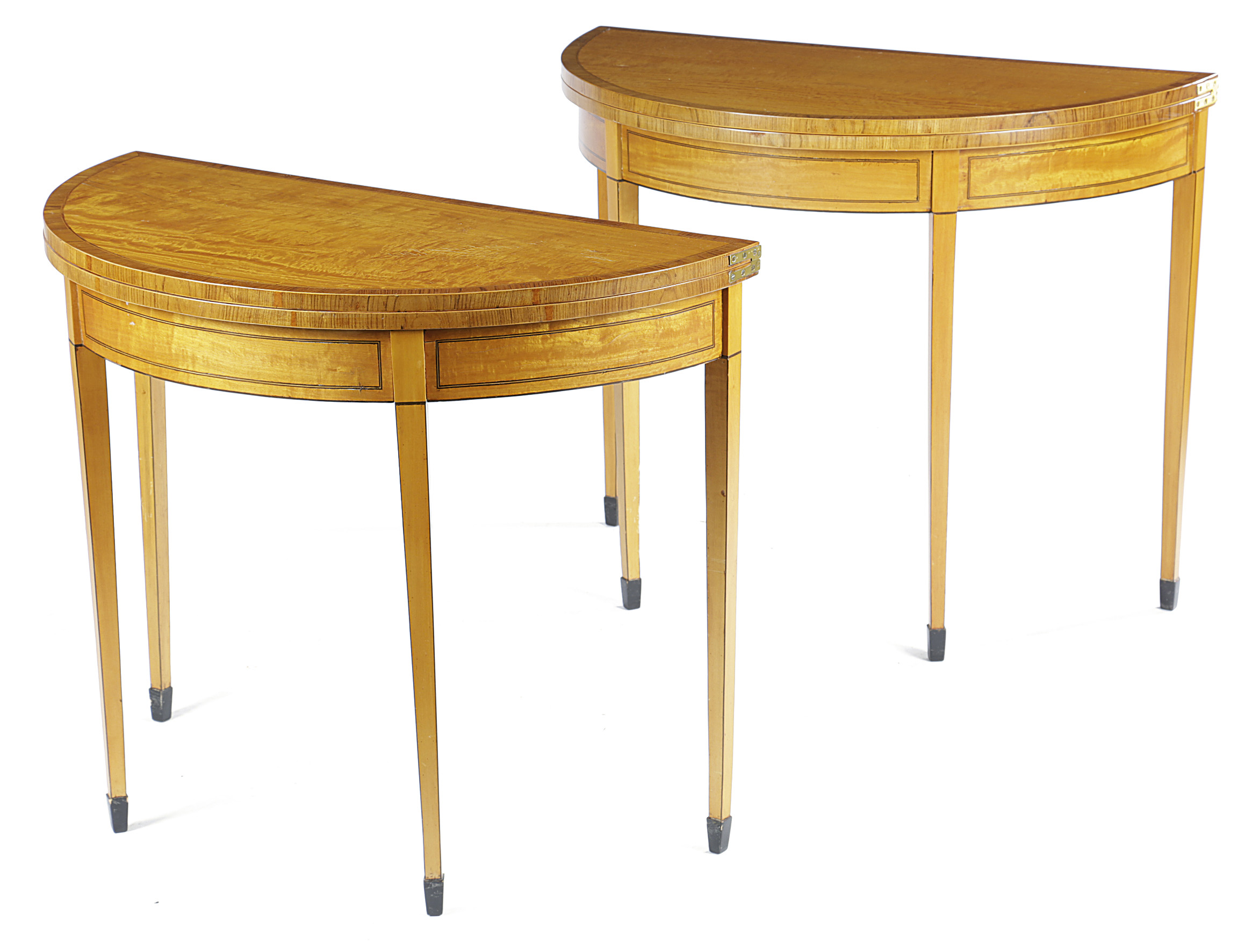 A PAIR OF SATINWOOD DEMI-LUNE CARD TABLES IN GEORGE III STYLE
