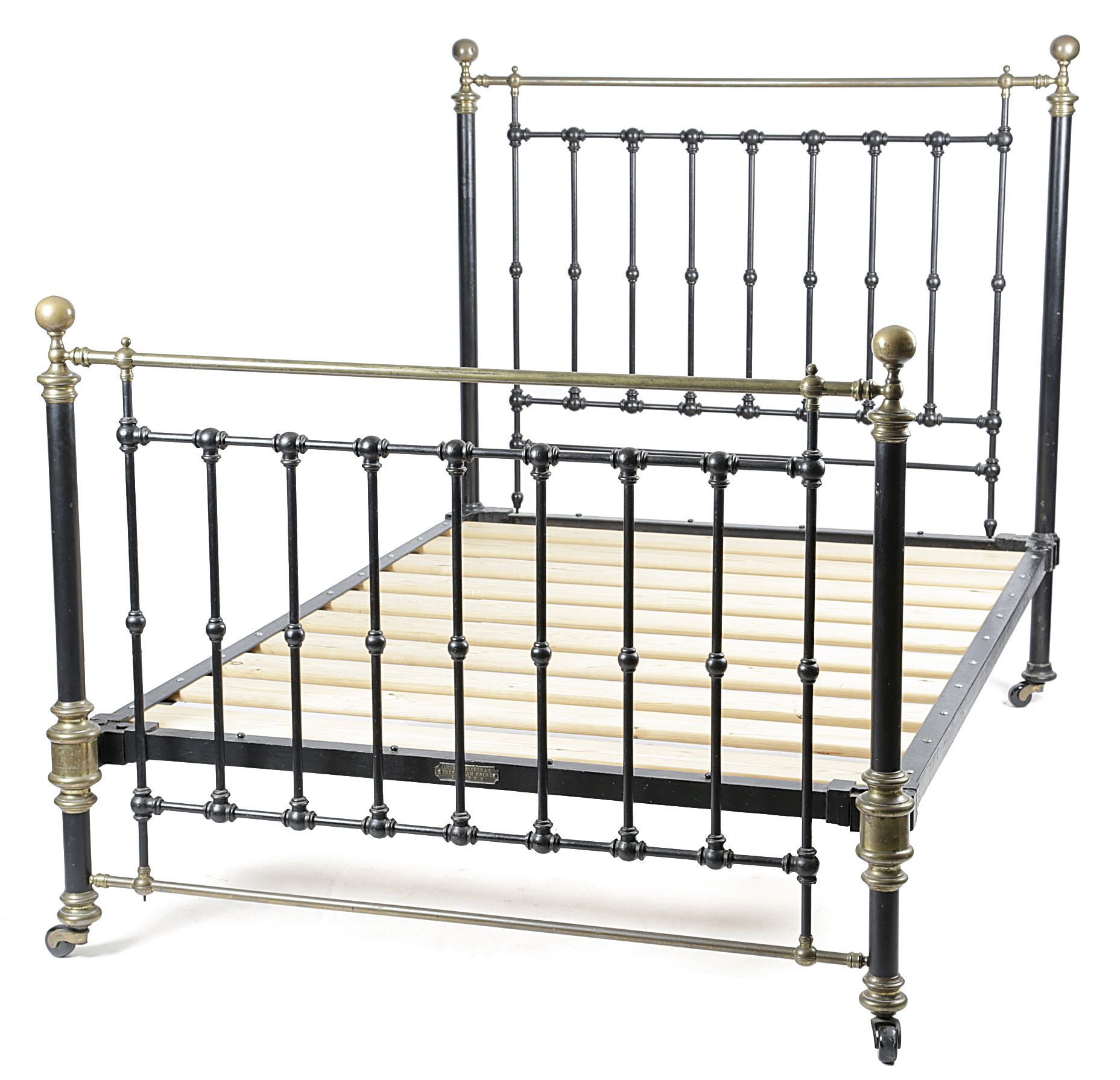 with turned ball finials and a railed head and footboard, on castors, with an applied brass plaque, inscribed 'James Shoolbred, Tottenham House, London'