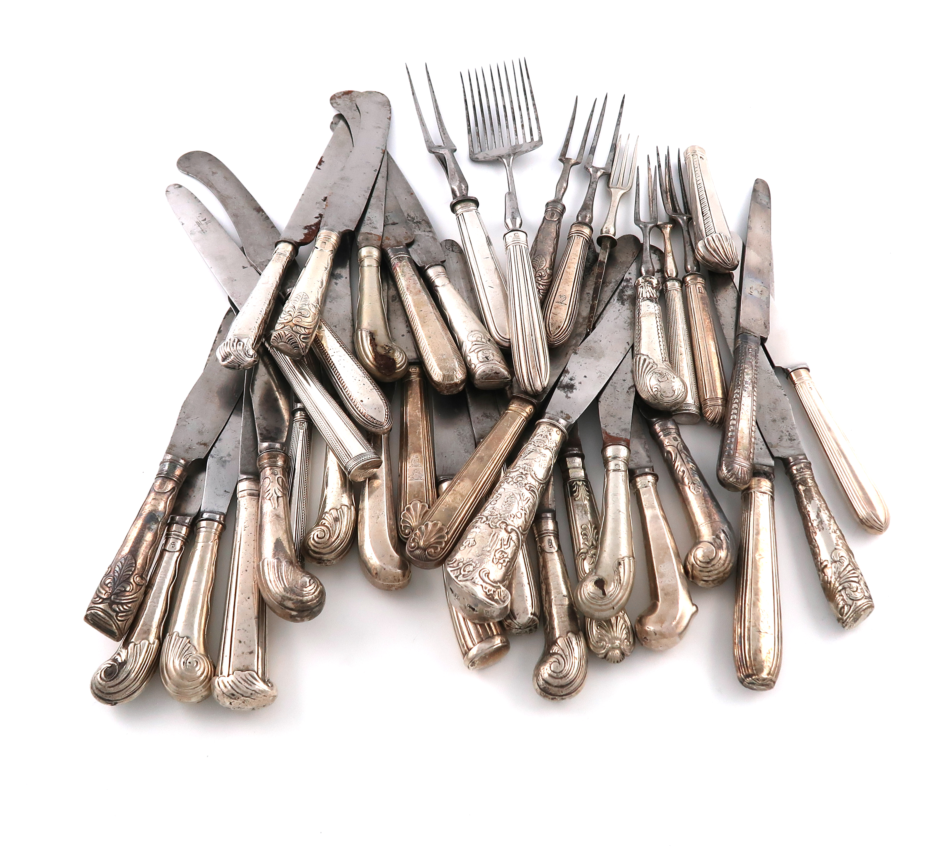 plus a silver-handed steel serving fork, Sheffield 1790, a carving fork, five table forks and a silver serving fork, lacking handle. (qty)