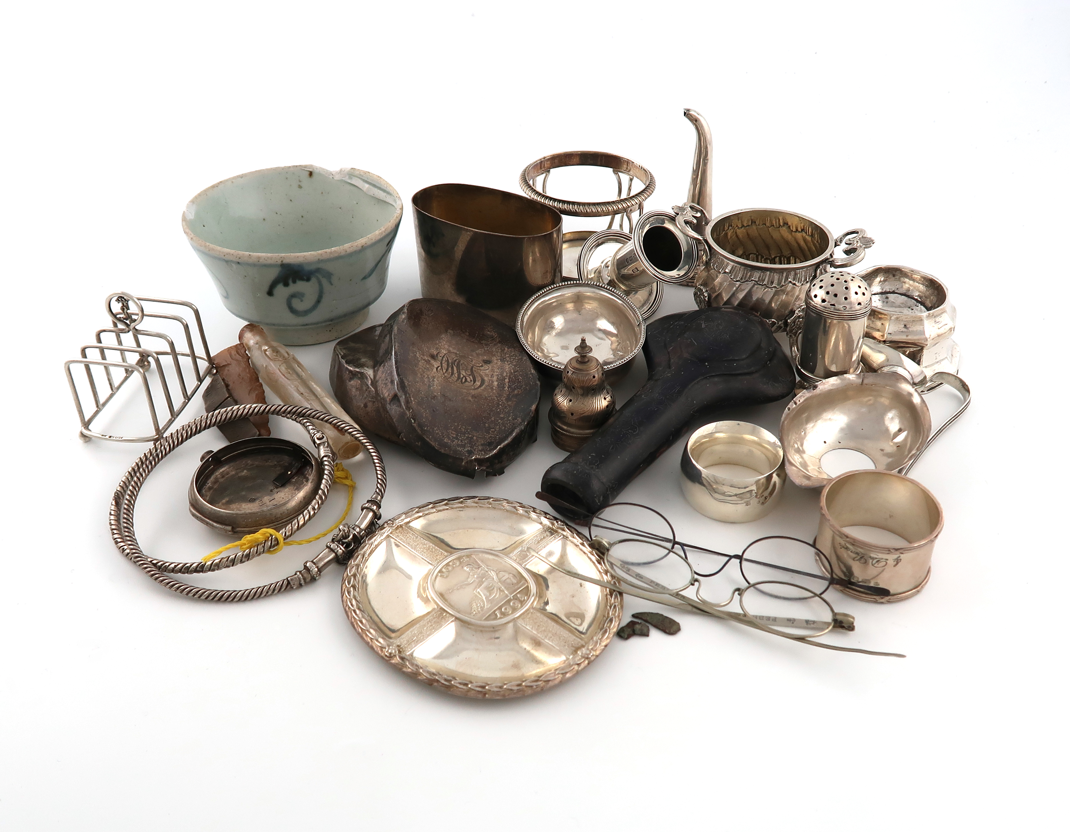 comprising silver items: a Bank of England Tercentenary dish, by Christopher Nigel Lawrence, London 1994, a pull-off base for a hip flask, two hairbrush backs, various bottle mounts and a watch case, two napkin rings, two punch ladle bowls, a small toast rack, wine funnel spout, a mustard pot, capital from a candlestick, a salt cellar, two twisted metalware neck bands, plus a blue and white ceramic bowl (damaged), a glass scent bottle (a.f) and other item, approx. weight 27.7oz. (qty)