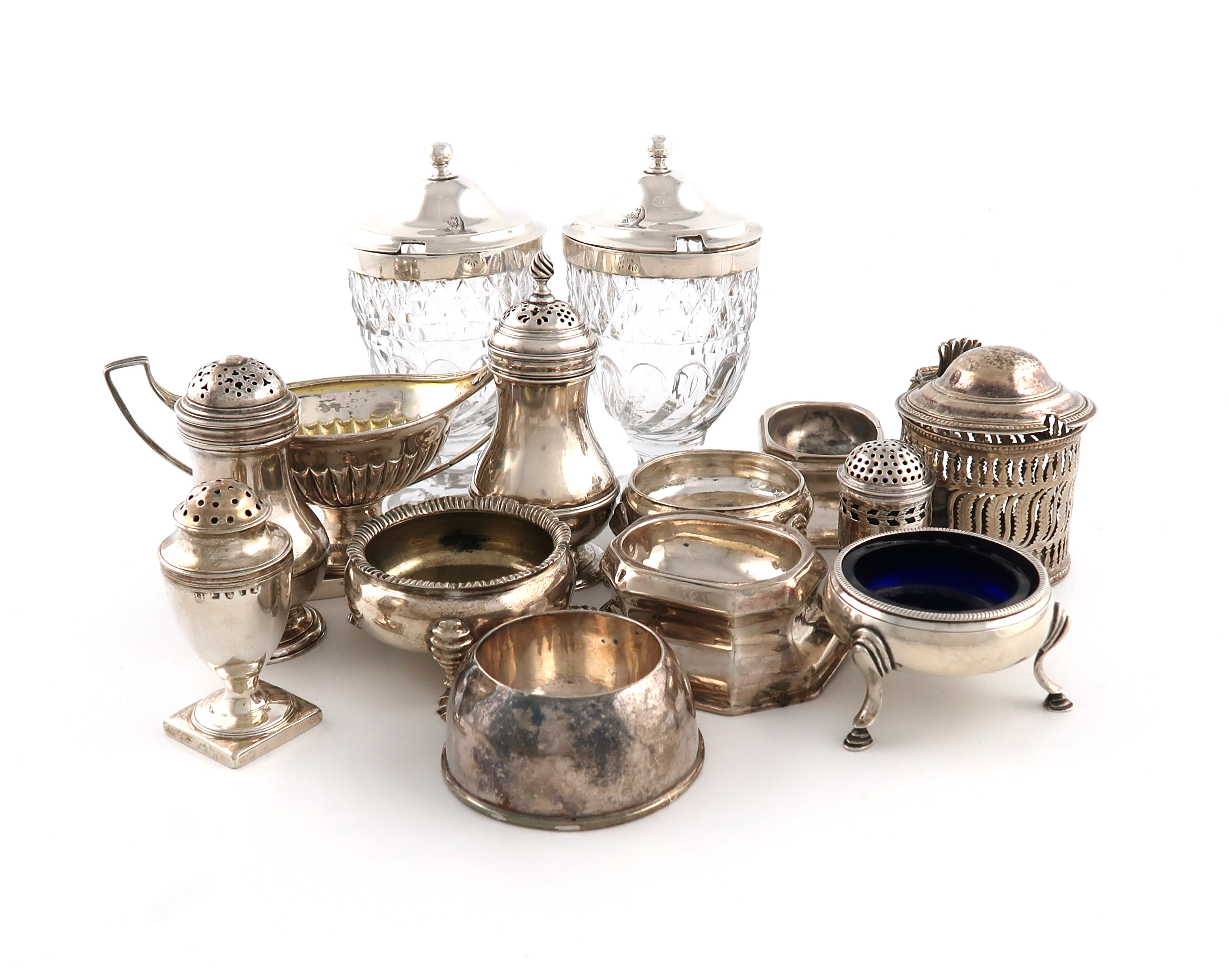 comprising: a pair of George III silver mounted cut-glass mustard pots, by Richard Cook, London 1802, oval vase form, pull-off raised covers with ball finial's, crested, a George III salt cellar, by Cornelius Bland, London 1792, also with a double duty mark, oval navette form, reeded decoration, on raised bases, scroll handles, four pepper pots (one with cancelled hallmarks) two trencher salt cellars, three cauldron salt cellars, one with blue glass liner, another salt cellar of domed circular form, plus a George III mustard pot, circular form, pierced and engraved decoration, lacking liner, approx. weight 25.8oz. (14)