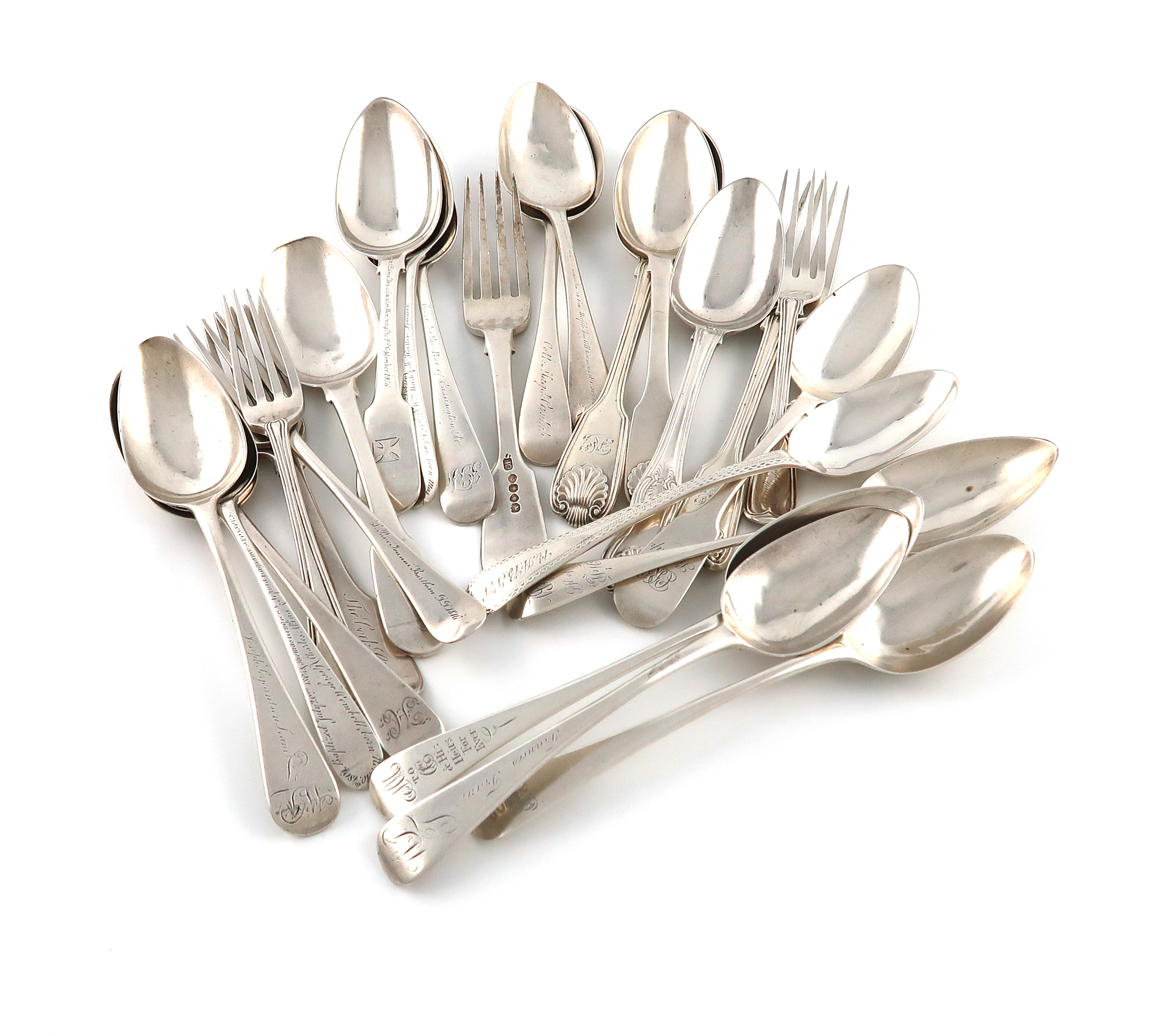 inscriptions include 'The Cork Club', 'Given by the Poor of Cassington', 'Ram Hotel', and others with presentation inscription and initials, many relating to baptisms, approx. weight 31.5oz. (qty)