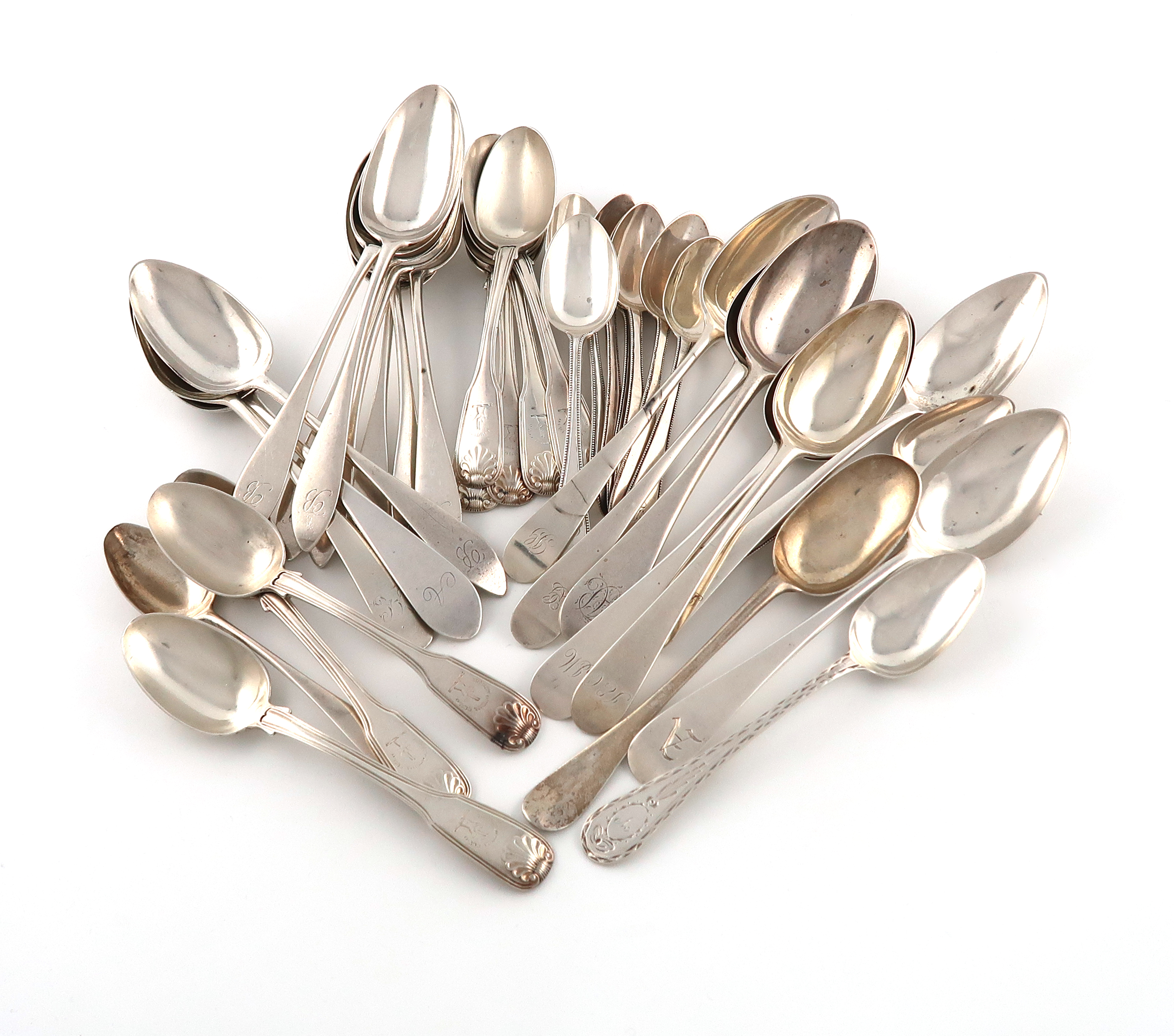 comprising: a set of eight George III Celtic-point pattern teaspoons, by J. McKay, Edinburgh 1789, the terminal with an initial 'B', plus a set of six Glasgow Fiddle, Thread and Shell pattern teaspoons, ten further dessert spoons, and ten teaspoons, approx. weight 30oz. (qty)