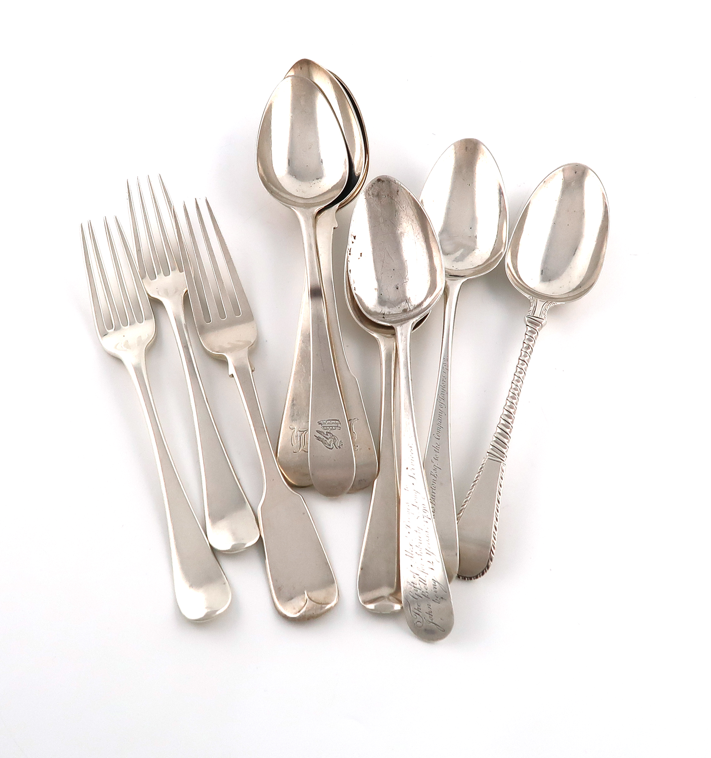 comprising: seven tablespoons, one of which inscribed 'The Company of Taylors 1792', and three table forks, approx. weight 20oz. (10)