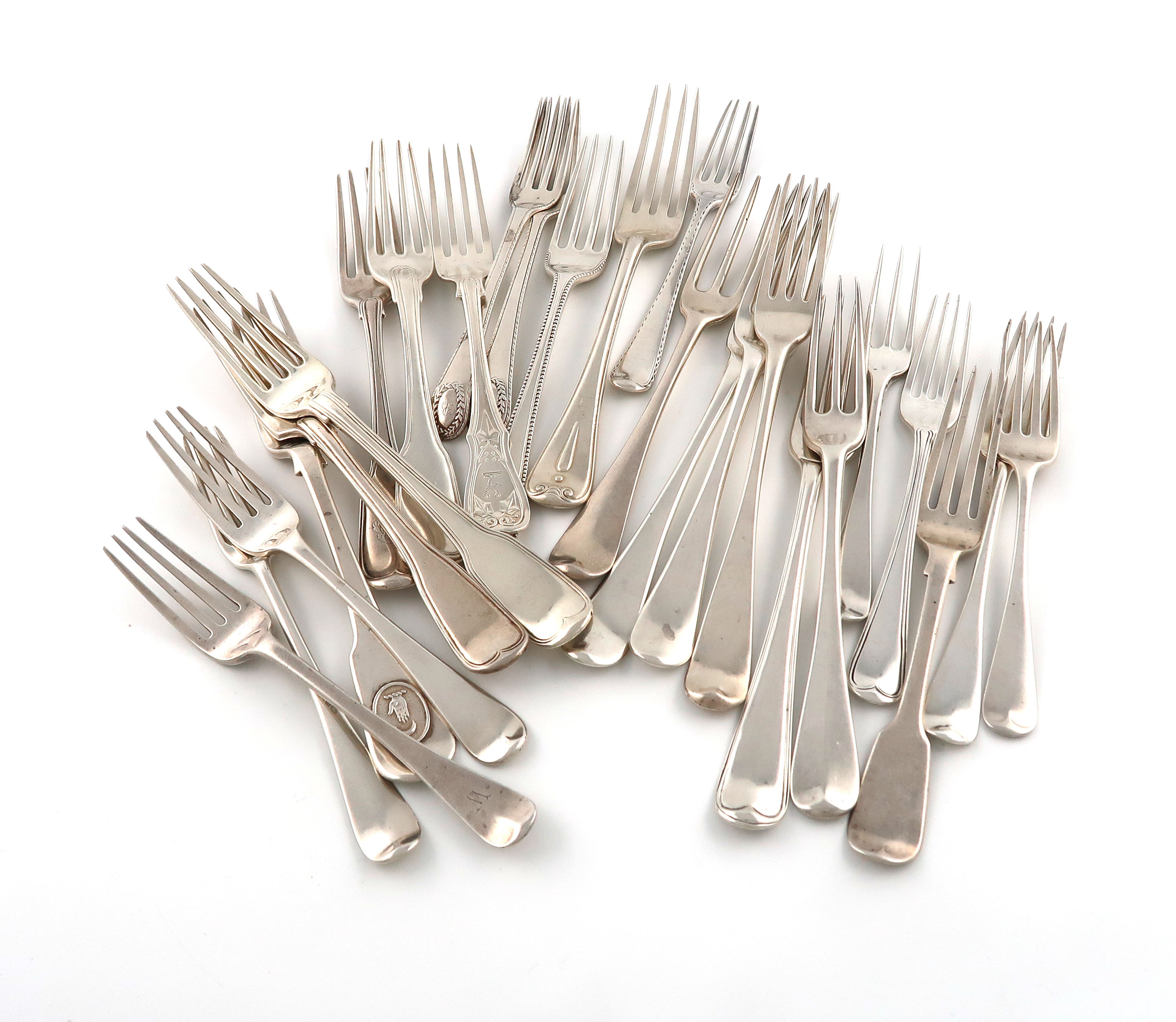 A collection of antique silver table and dessert forks,