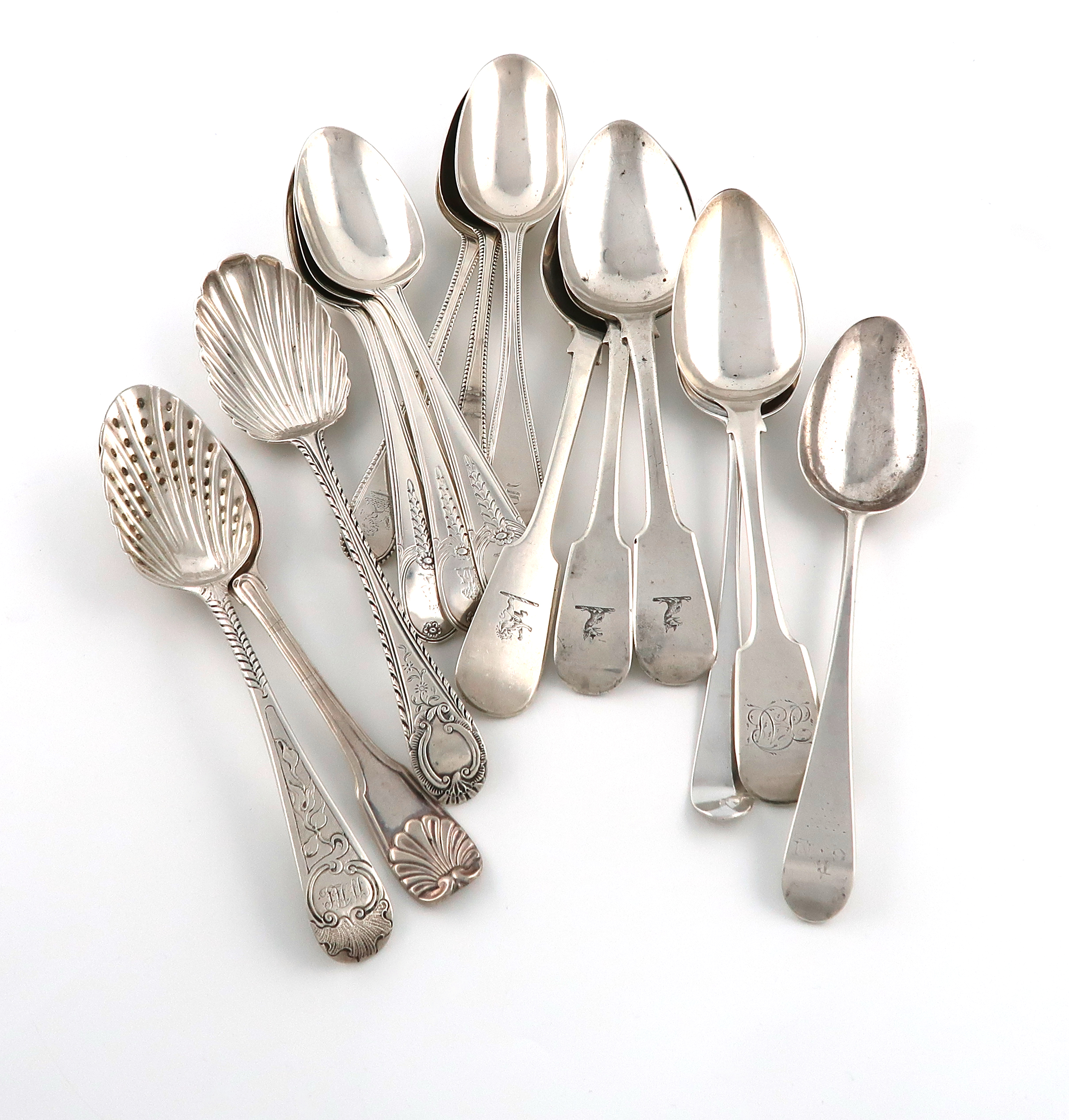 A collection of fifteen antique silver tablespoons,