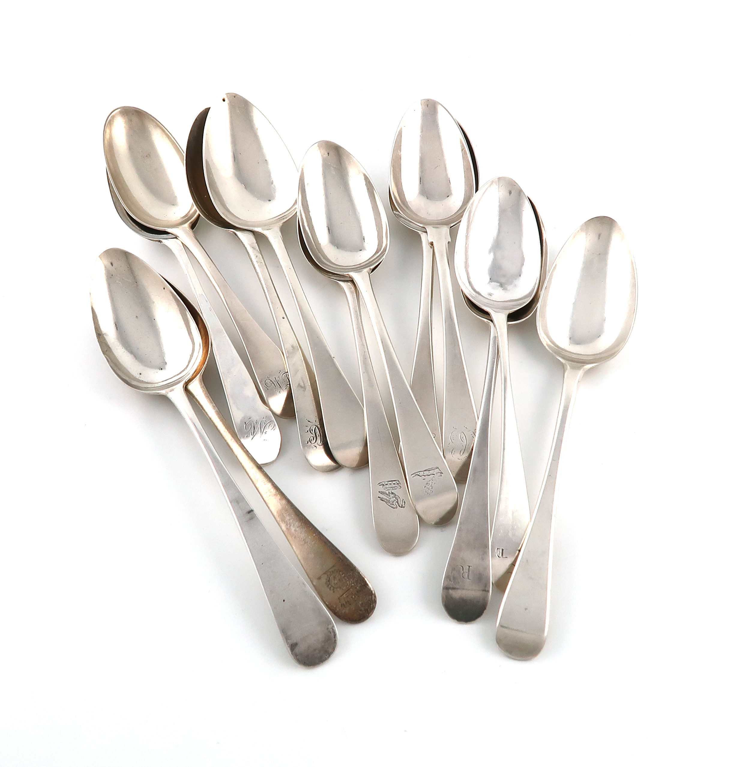 A collection of thirteen antique silver Old English pattern tablespoons