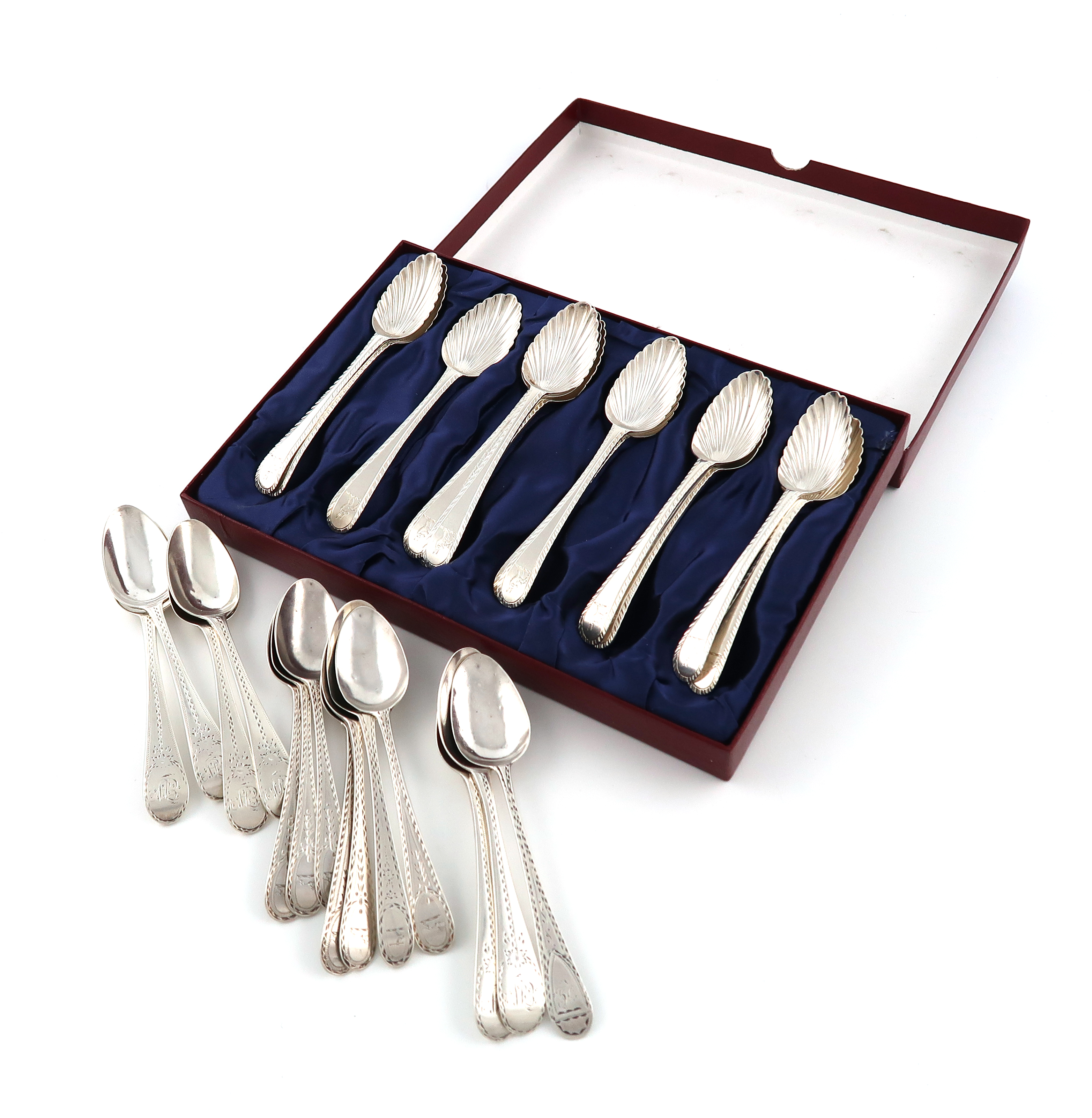 fluted bowls, the terminals with a crest, plus a set of six George III Bright-cut teaspoons, London 1785, a similar matched set of eight, London 1783, approx. weight 11.5oz. (26)