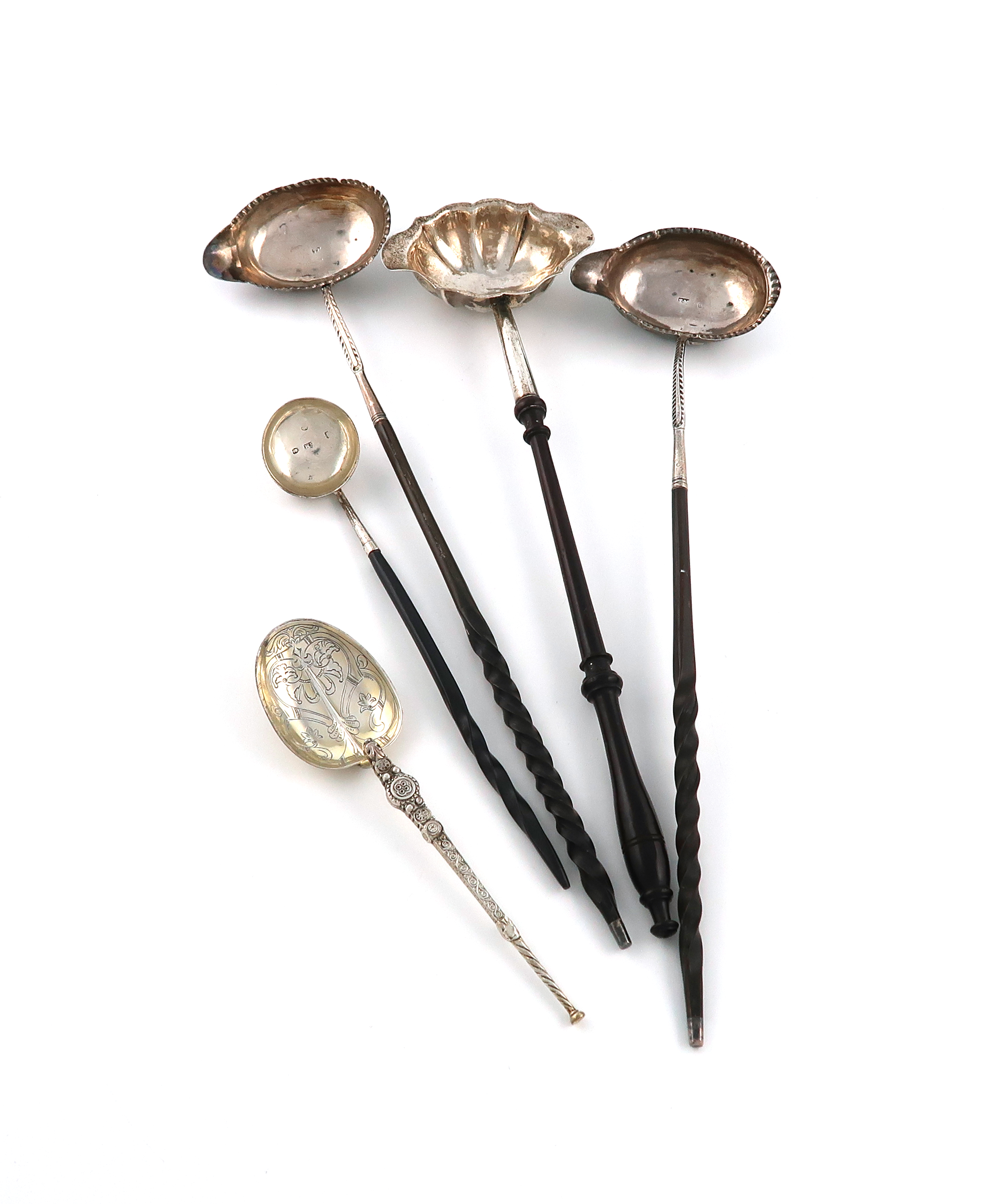 comprising: a silver-gilt anointing spoon, by Elkington and Co., Birmingham 1910, plus three punch ladles and a toddy ladle, three of which have twisted whale-bone handles, approx. weighable 3oz. (5)