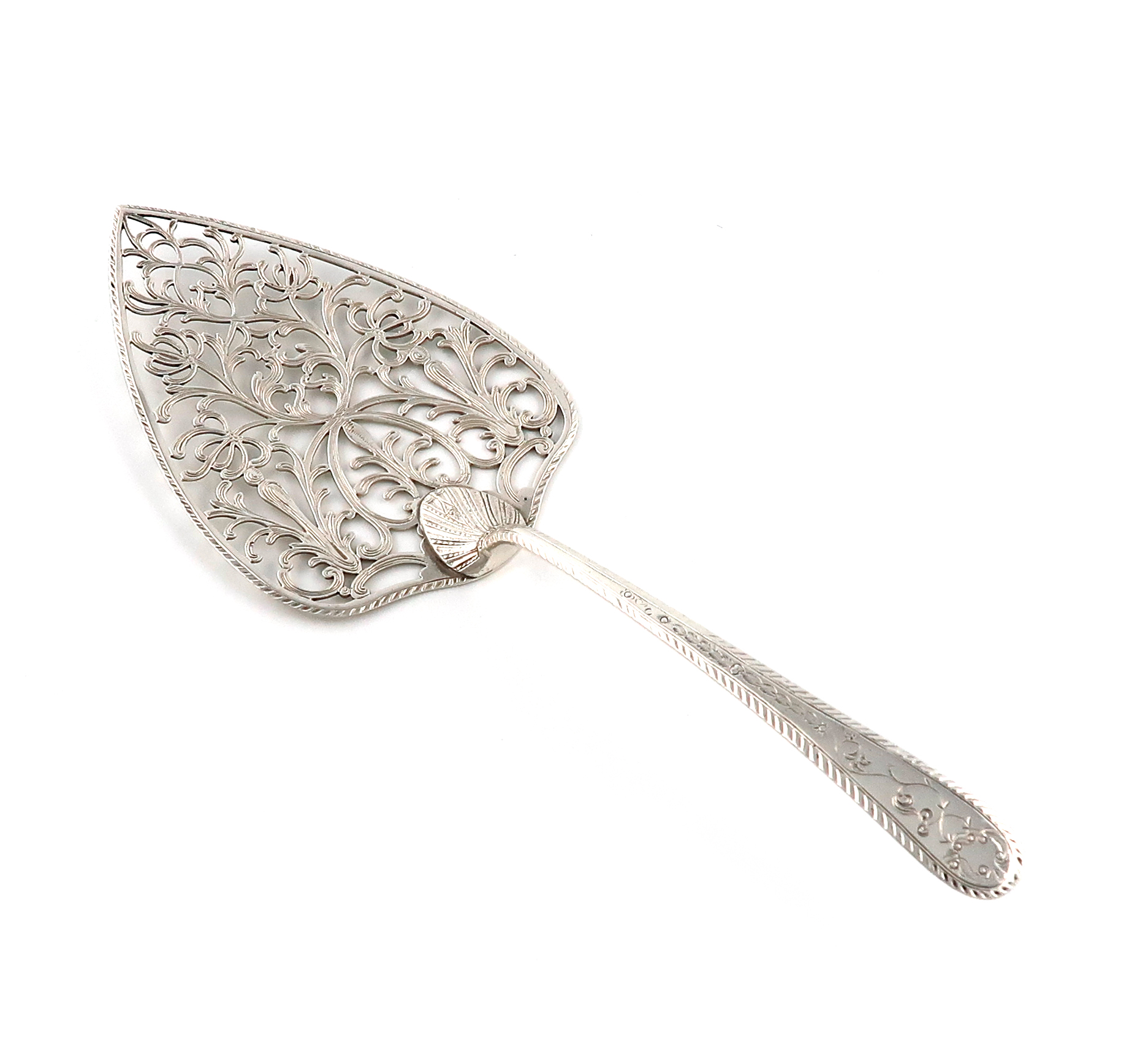 trowel form, the blade pierced with foliate decoration and feather-edge border, the handle with engraved foliate and feather-edge decoration, length 31cm, approx. weight 4.7oz.