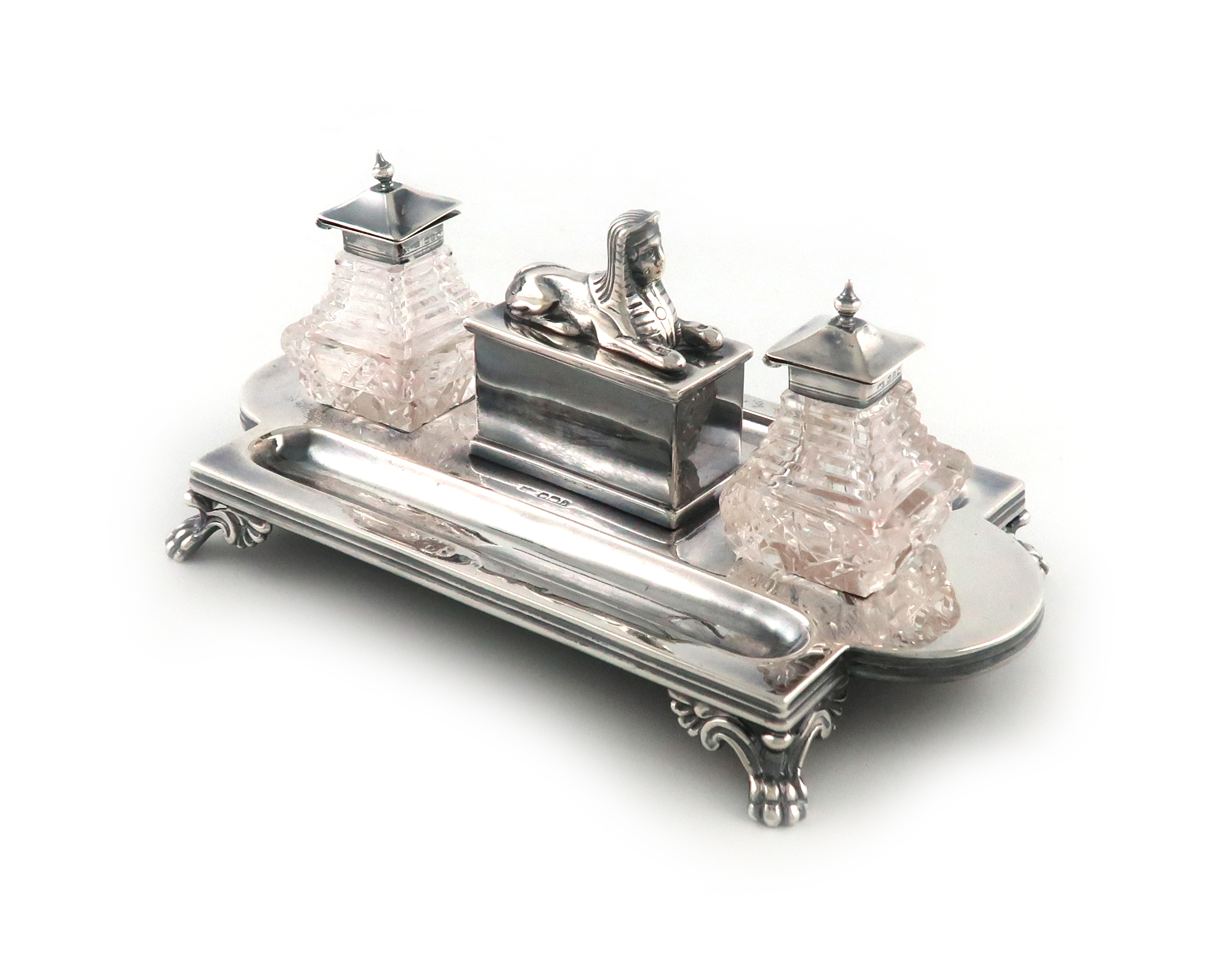 shaped rectangular form, with two pen wells, with a central box with a pull-off cover with a sphinx, on four paw feet, with two silver-mounted cut glass inkwells, by Henry Manton, Birmingham 1896, length 26.5cm, approx. weighable 21oz.