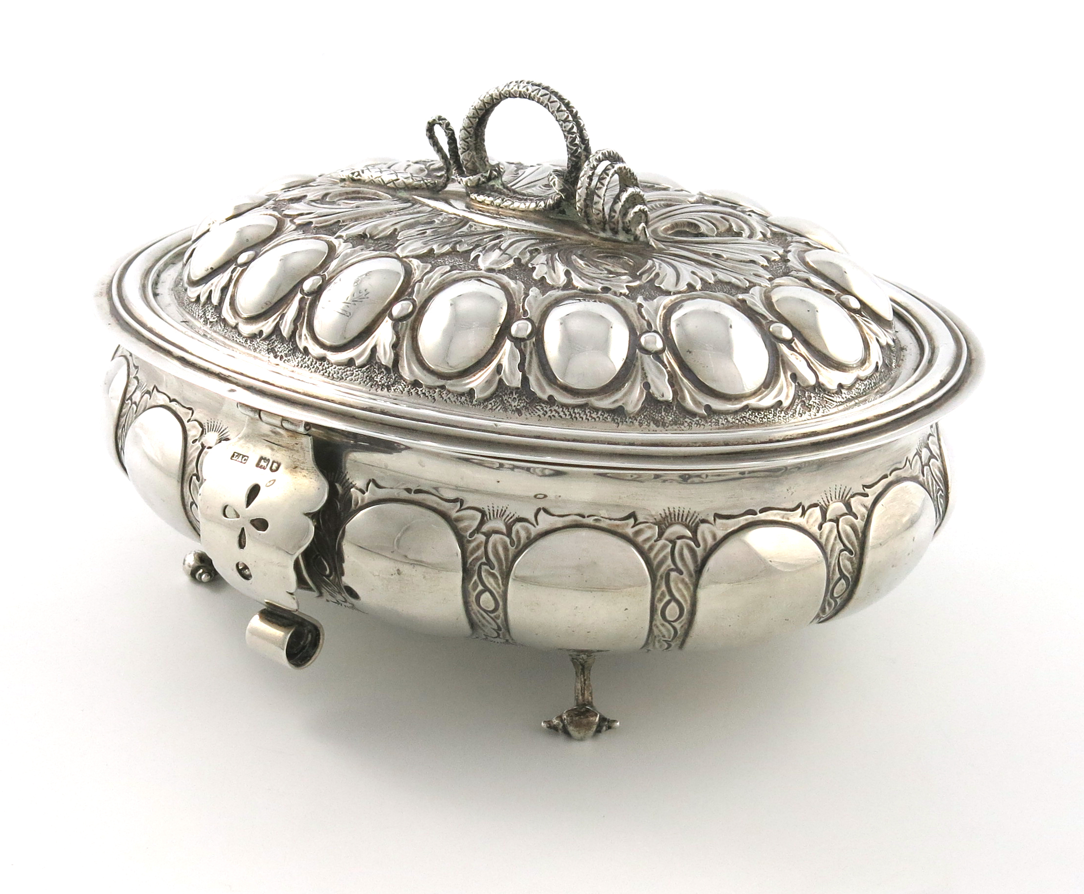oval form, embossed foliate decoration, the hinged cover with a snake handle and crest, on four scroll feet, the interior fitted with lift-out oval frame with three hinged covers with two inkwells and a stationary box, engraved with a crest, one liner missing, length 19.5cm, approx. weight 46.9oz.