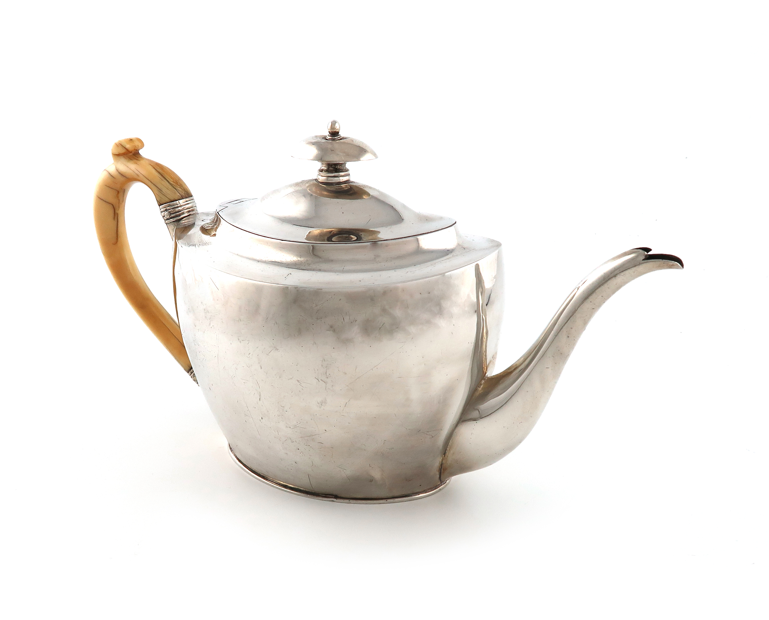 oval form, flushed hinged domed cover with an oval finial, ivory scroll handle, length handle to spout 31cm, approx. weight 20oz.