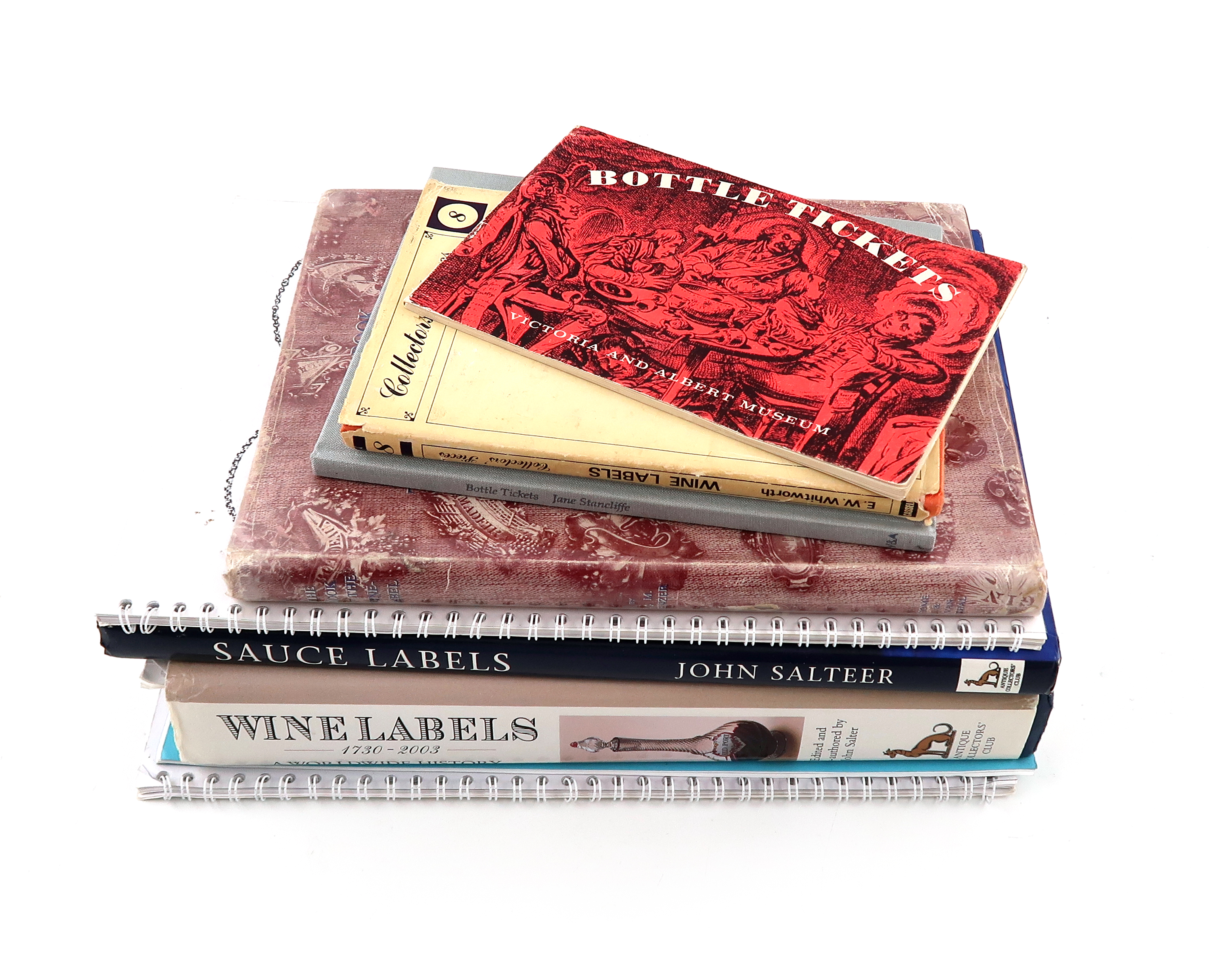 comprising: Salter, J., Wine Labels 1730-2003, A Worldwide History, Antique Collectors' Club 2004, Sauce Labels, by the same author, The Wine Label Circle 2002, Penzer, N., The Book of The Wine Label, 1947, plus other volumes, and a copy of The Marshall Collection of Labels for Wines, Spirits, Sauces and Toilet Waters. (7)