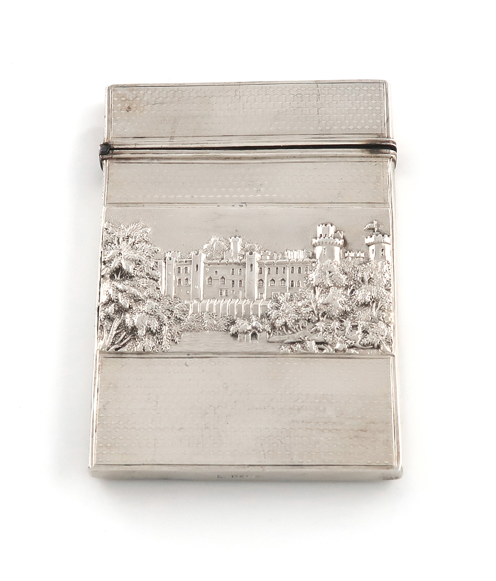 rectangular form, the front with a scene of Warwick Castle, the reverse with a scene of Kenilworth castle ruins, with engine-turned decoration, length 9.3cm, approx. weight 2.3oz.