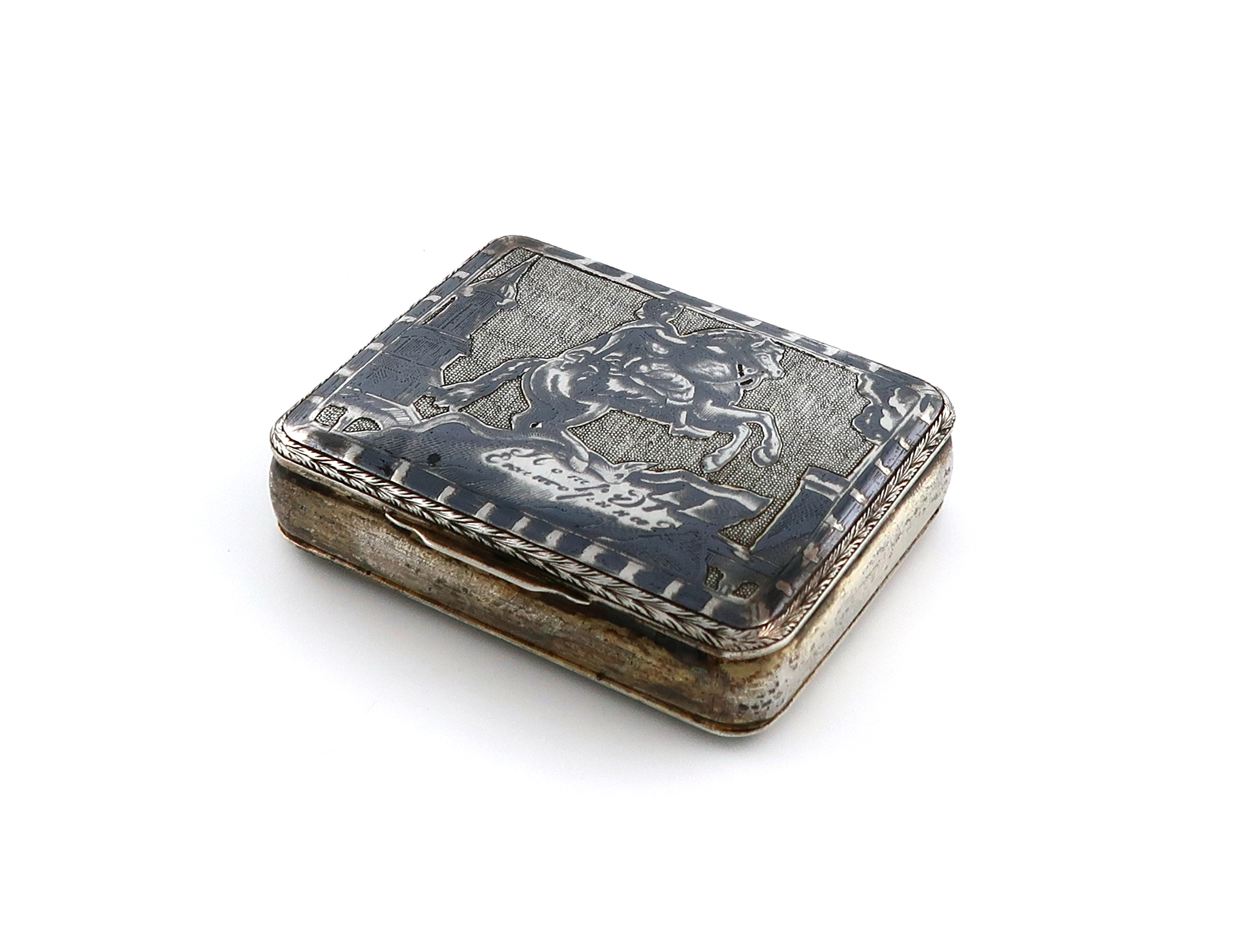 rectangular form, the cover with Peter the Great on horseback, the underside with a port scene, length 8cm, approx. weight 3.5oz.