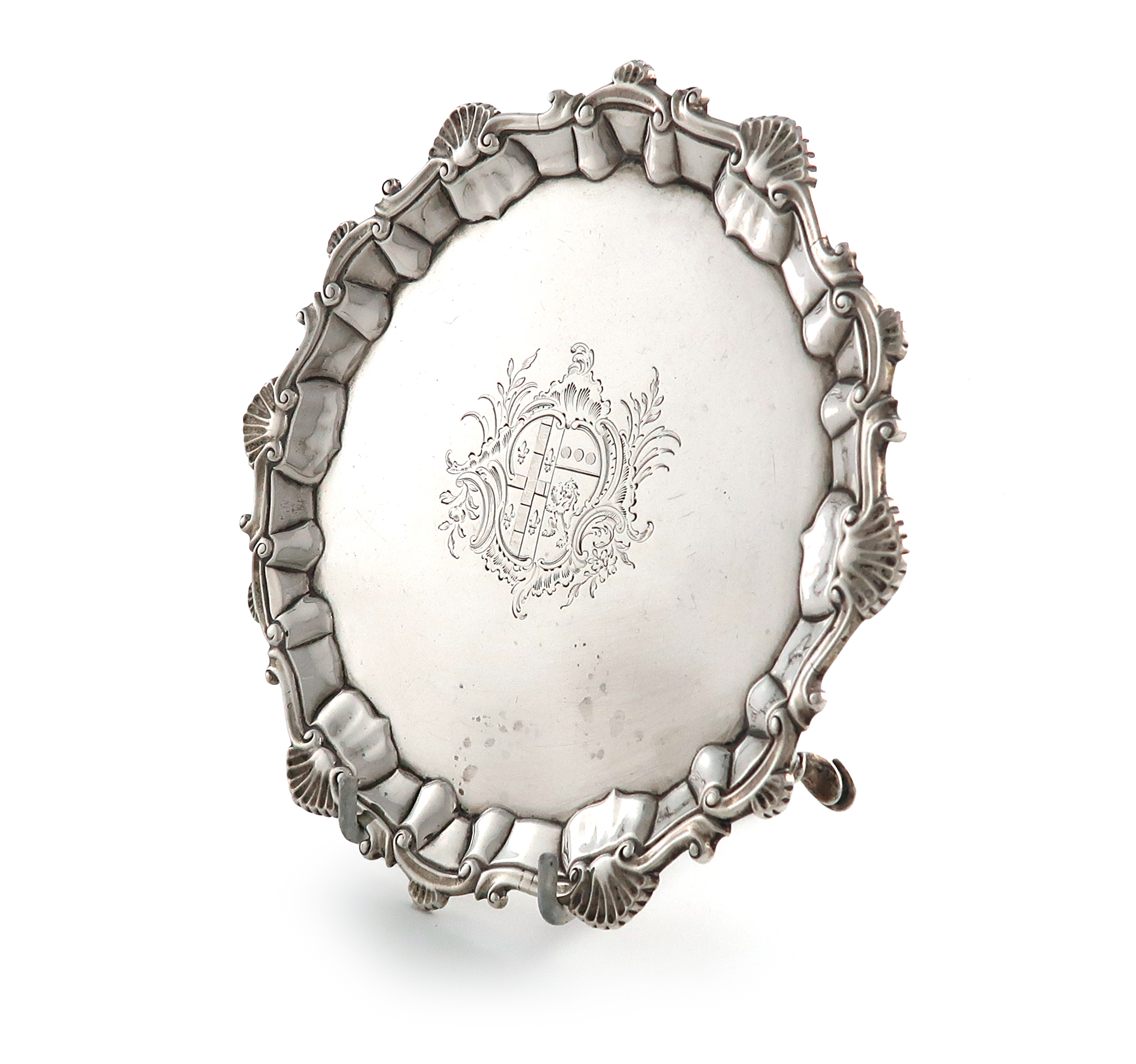circular form, shell and scroll border, the centre with an armorial within foliate scroll mantling, on four hoof feet, diameter 17.5cm, approx. weight 7.9oz.