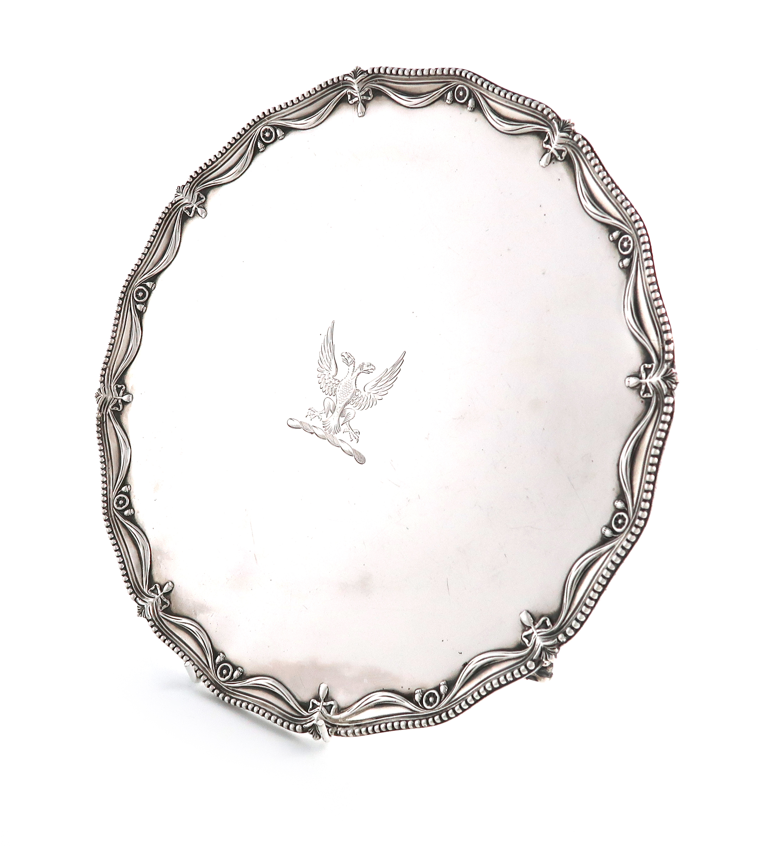 circular form, with ribbon tied drapes, medallions, and beaded borders, on three claw and ball feet, the centre with a crest, diameter 31.5cm, approx. weight 28.8oz.