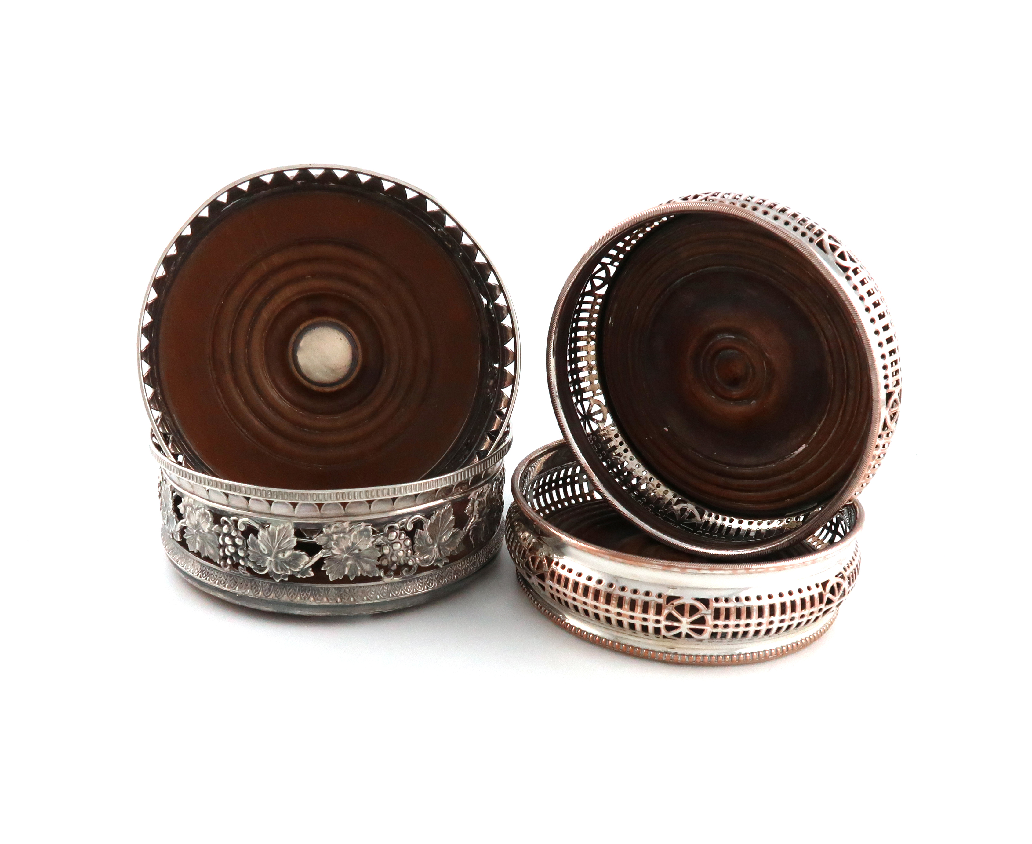 circular form, pierced and chased with trailing grapevines and bunches of grapes, pierced border, the turned wooden bases with unmarked central buttons, diameter 15cm, height 5.8cm, plus a pair of electroplated wine coasters, of circular form, pierced with vertical slats, wooden bases. (4)
