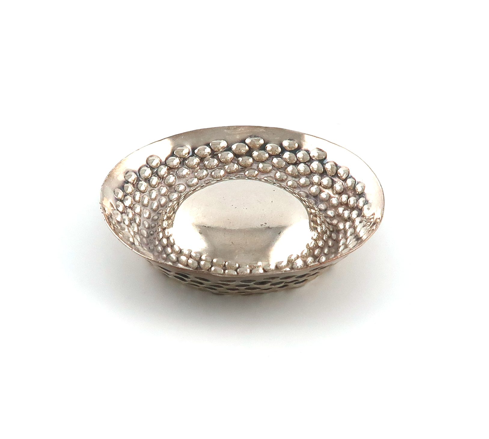 tapering circular form, raised centre, punch bead decoration, engraved 'John Sampson 1776', diameter 10.4cm, approx. weight 3.6oz.
