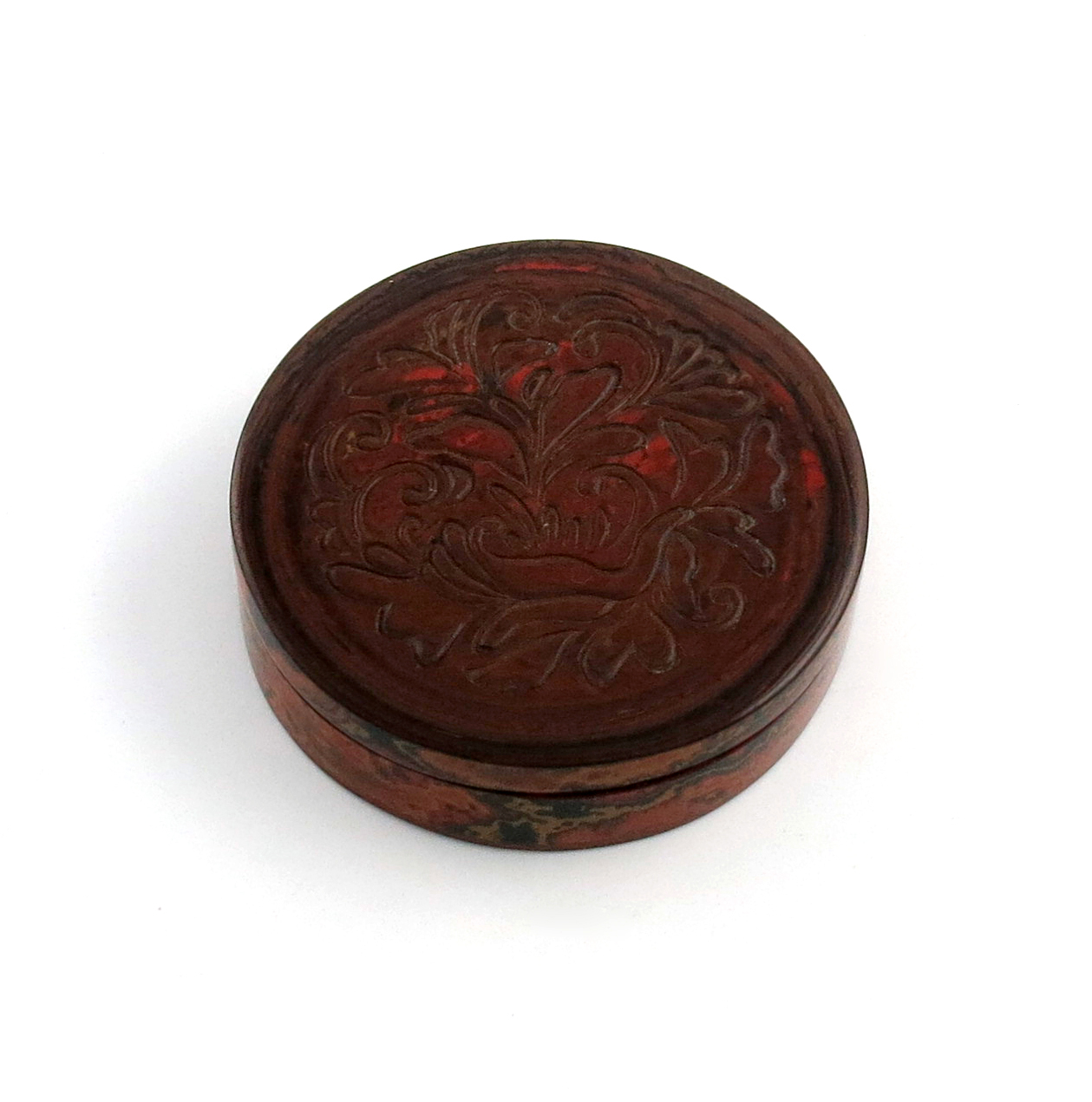 circular form, the body and base simulated to represent stone, the pull-off cover with engraved foliate decoration, (cover loose), diameter 8.3cm.