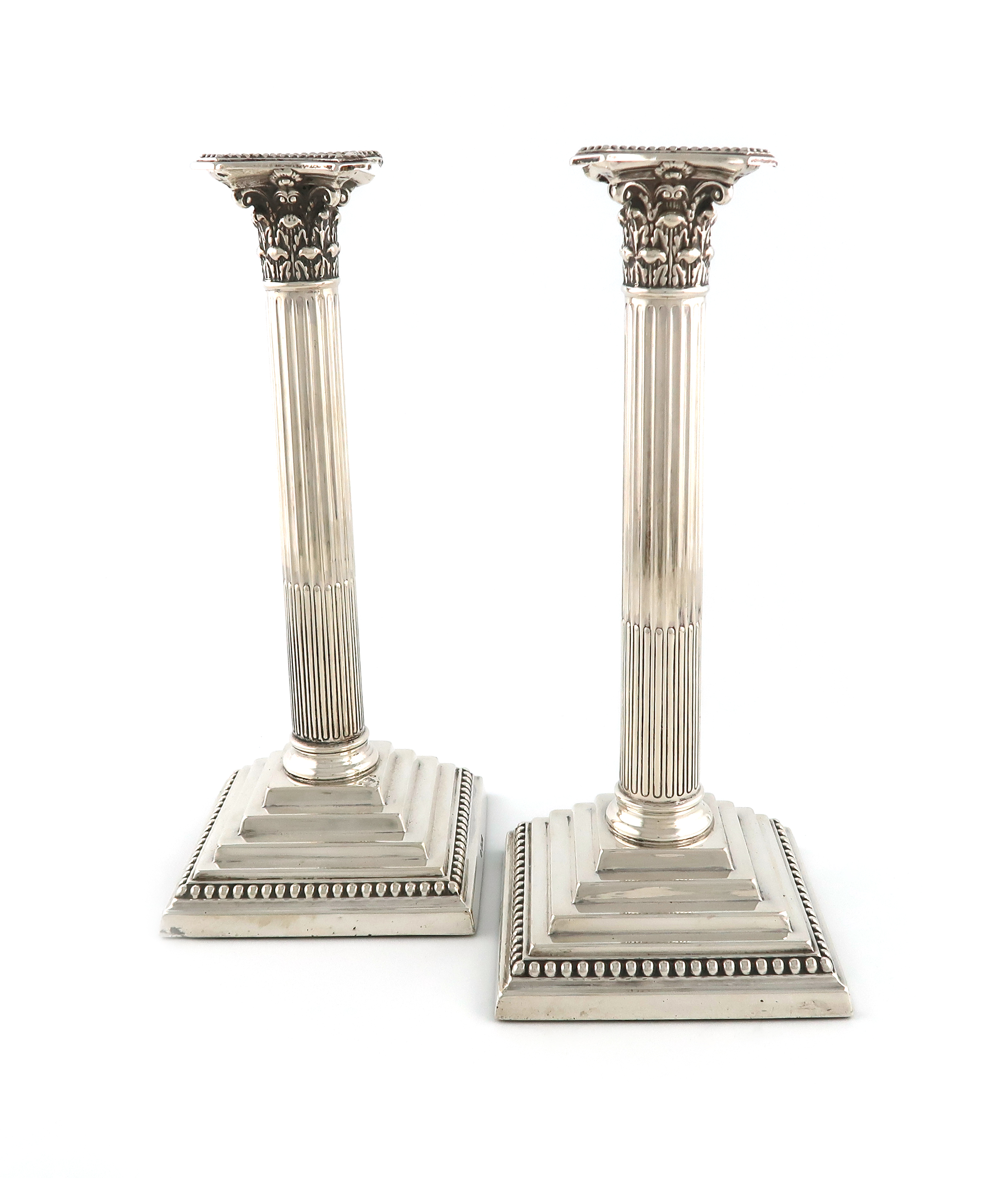 Corinthian column form, beaded borders, on stepped square bases, with a presentation inscription, height 29cm.