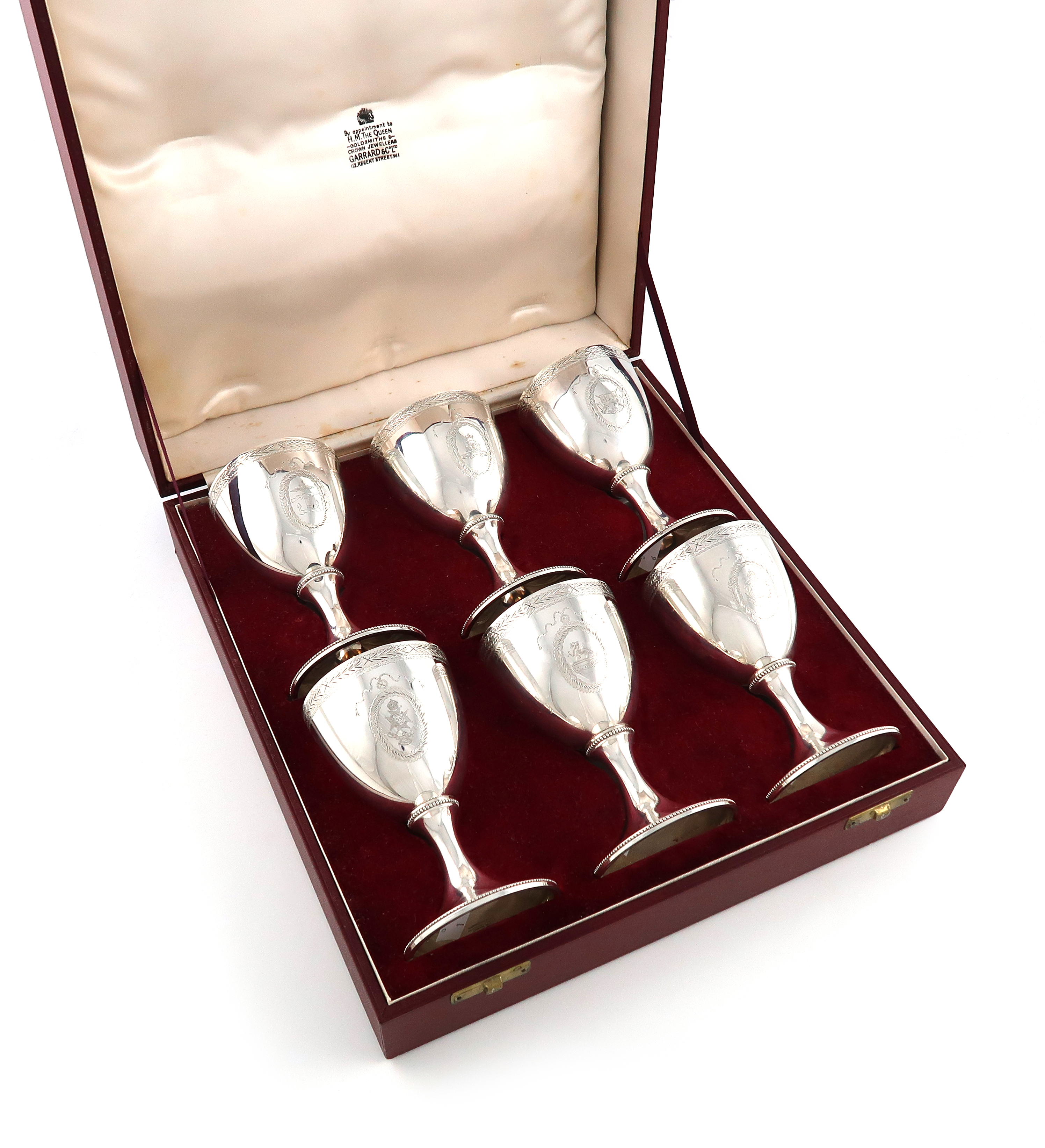 in the George III manner, plain bowls, gilded interiors, on a raised beaded circular foot, all inscribed K.D Dance, and with the badges of the Royal Berkshire Regiment 1939-41, 55 Frontier Force Rifles, 1941-46, The Khyber Rifles, 1946-49, The Royal Artillery 1949-58, The Isle of Wight Rifles, 1950-53, and The Combined Operations badge,1956-58, in a fitted case, height 13.6cm, approx. weight 34oz. (6)