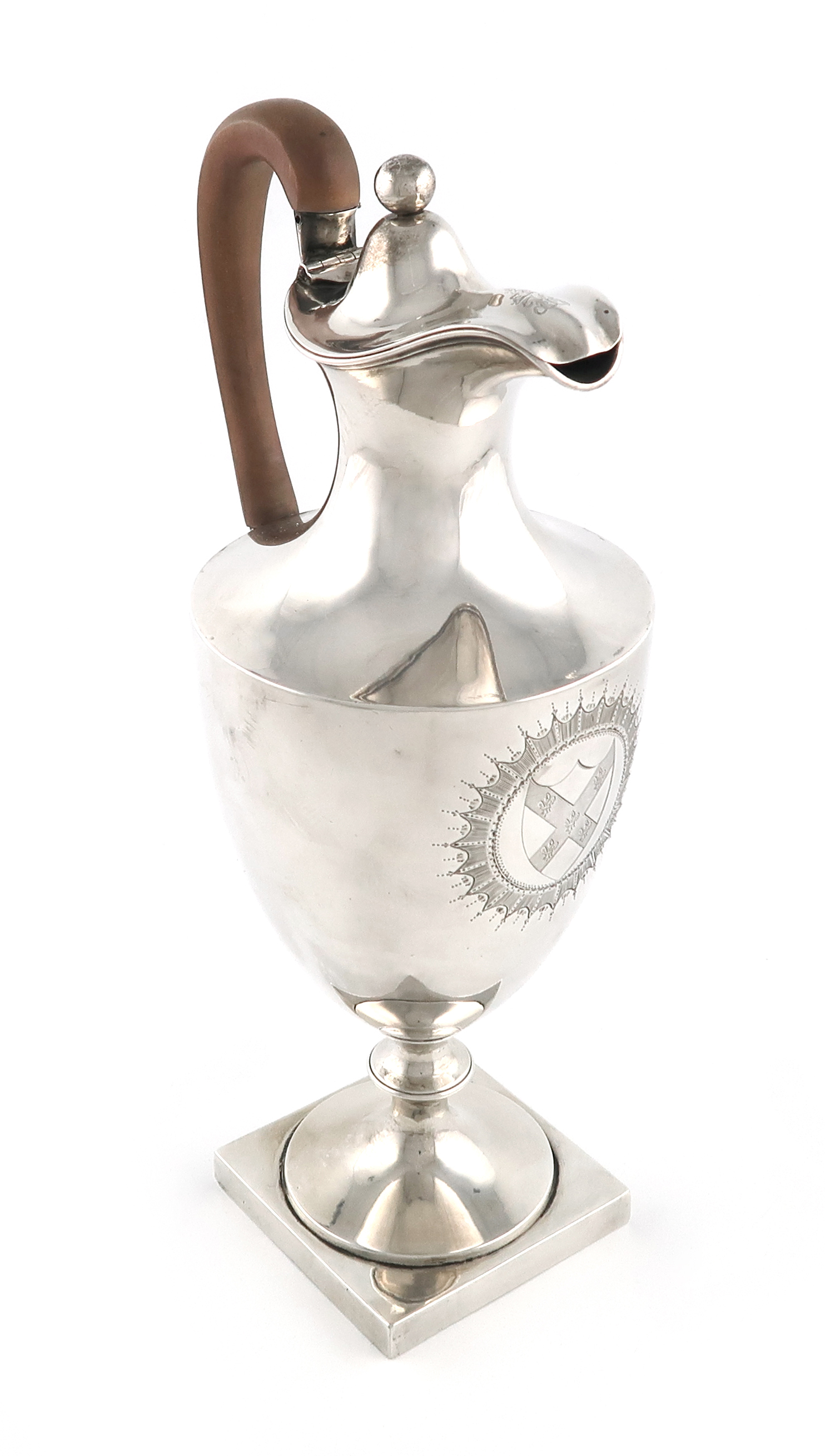 plain vase form, scroll handle, domed hinged cover with a ball finial, engraved with an armorial shield with star mantling, on a raised square foot, height 31cm, approx. weight 24.5oz.