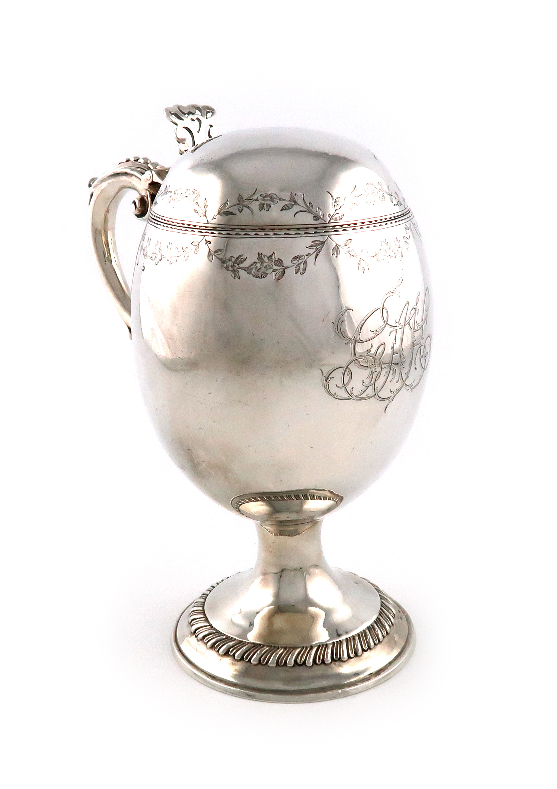 ovoid form, engraved foliate borders, leaf capped beaded scroll handle, the domed cover with a pierced thumb-piece, on a raised circular foot with a gadroon border, engraved with a monogram, height 24.5cm, approx. weight 38oz.