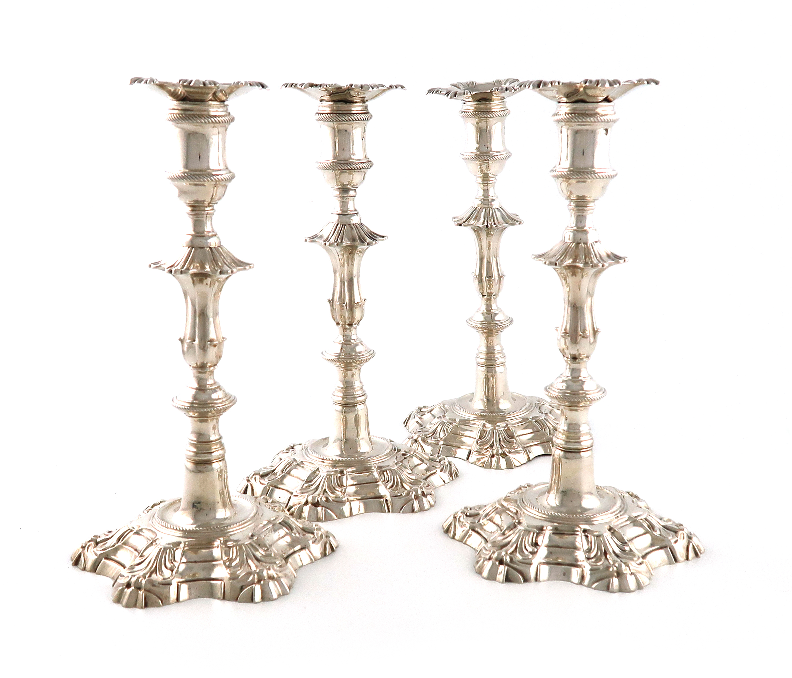 knopped baluster form, shell shoulders, spool-shaped capitals, rope-work borders, removable drip pans, on raised shaped hexafoil bases with shell motifs, the undersides with scratch weights, height 23.7cm, approx. weight 80oz. (4)