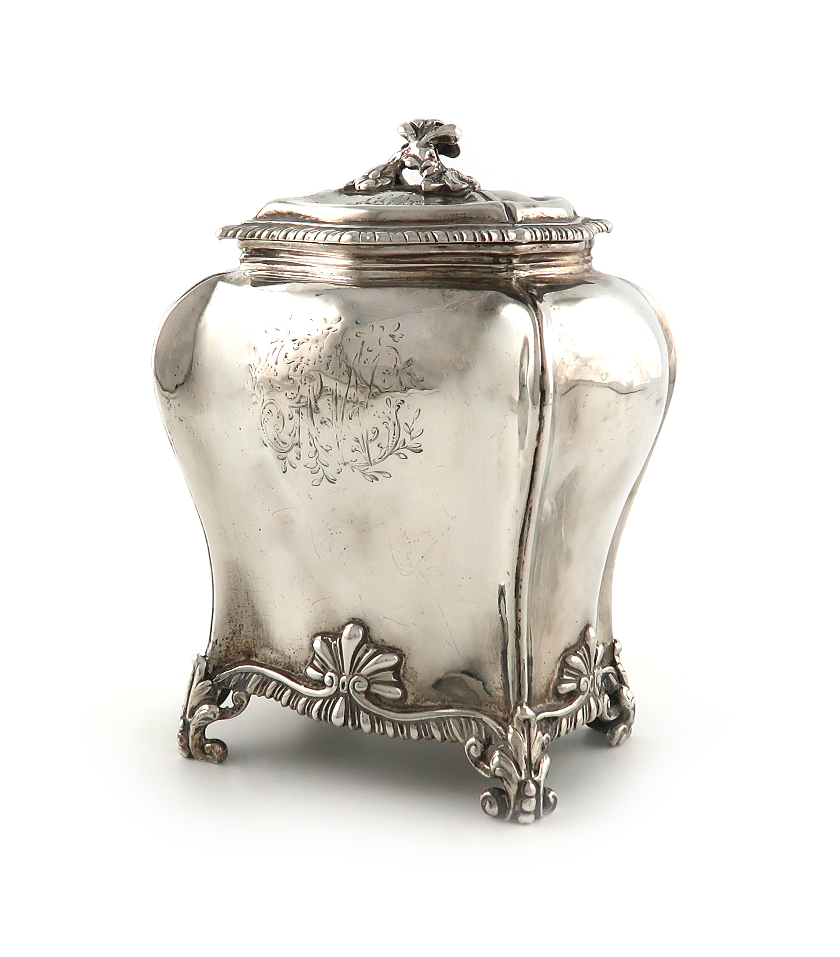 shaped rectangular bombe form, the pull-off cover with a flower finial and gadroon border, on four pierced scroll bracket feet with shell motifs, engraved with an armorial and crest, height 13.5cm, approx. weight 8oz.