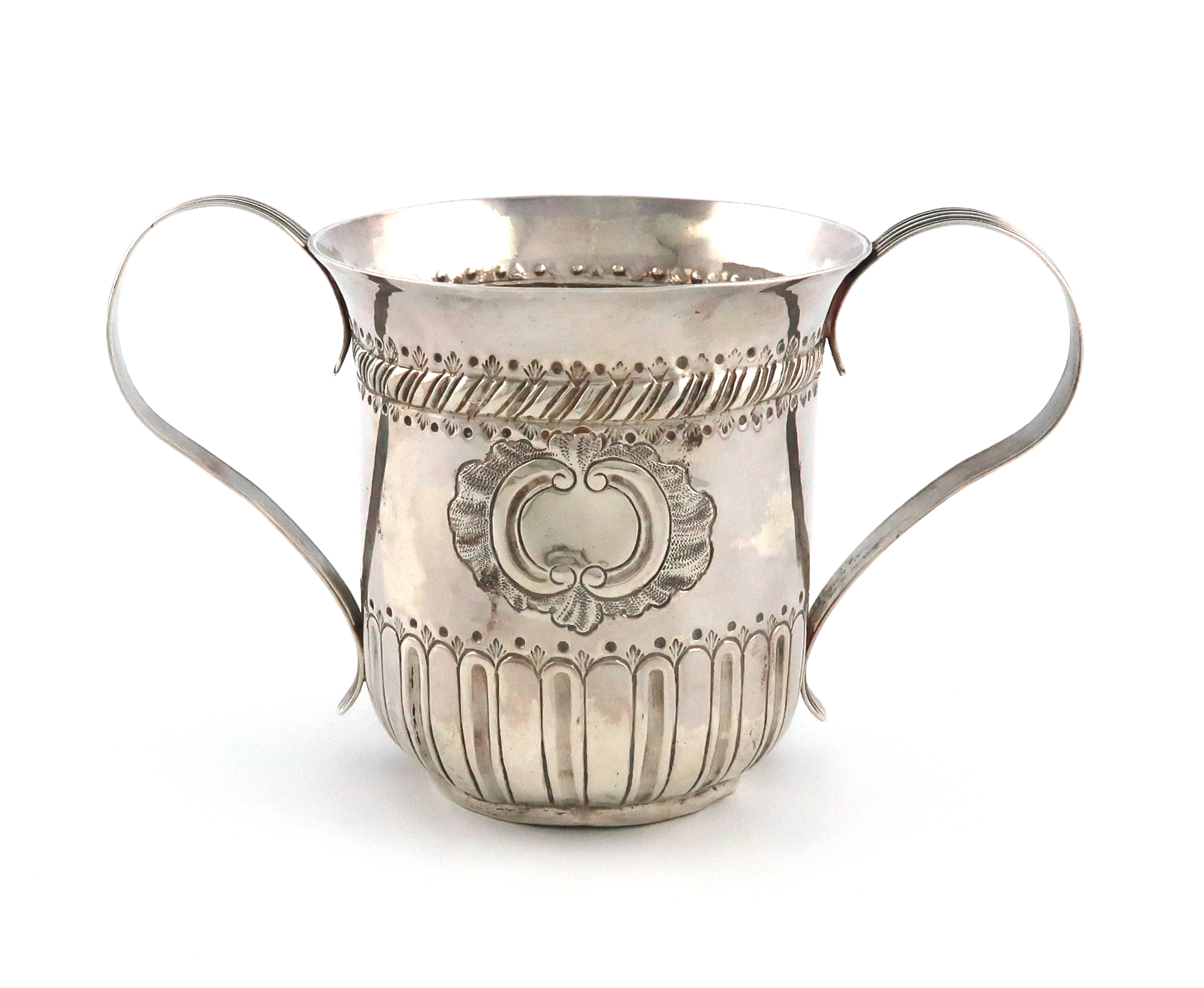 circular form, reeded scroll handles, rope-work girdle above part-fluted decoration, with a vacant cartouche with scroll mantling, height 10.5cm, approx. weight 5.5oz.