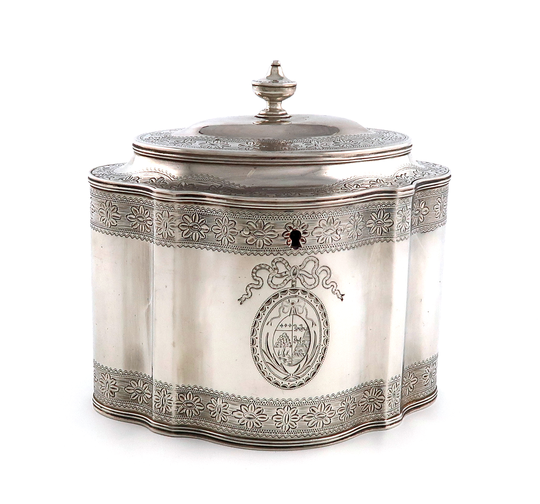 shaped oval form, bright-cut foliate decoration, the hinged cover with an urn finial, the front with ribbon-tied oval cartouche, engraved with an armorial, with a lock, length 14.5cm, approx. weight 14.7oz.