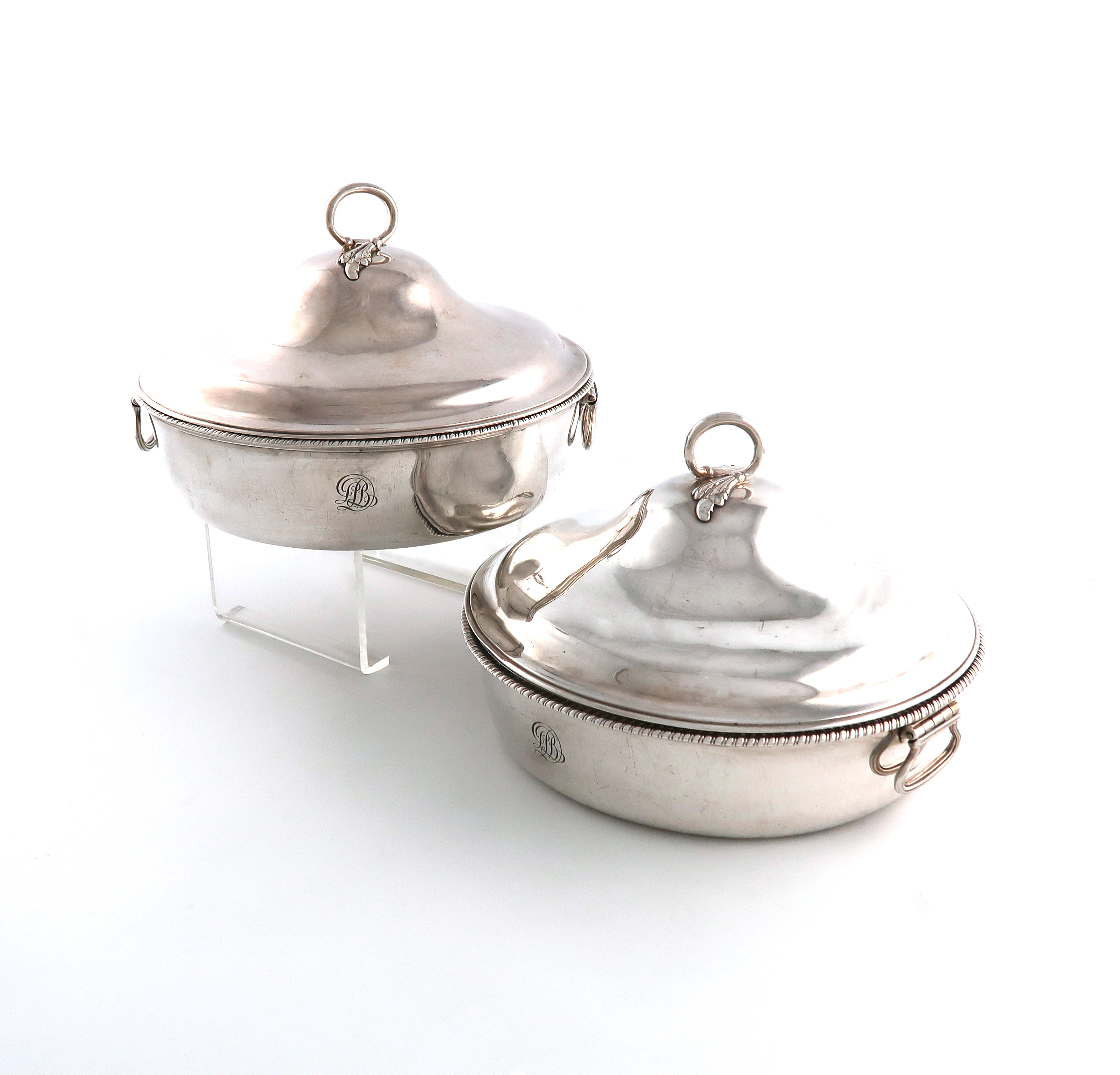 circular form, hinged reeded drop-ring handles, the pull-off covers with leaf capped scroll handles, gadroon borders, engraved with initials, the undersides inscribed 'No.2, 37"12' and '3,36"6', diameter 22.1cm, approx. weight 68.7oz. (2)