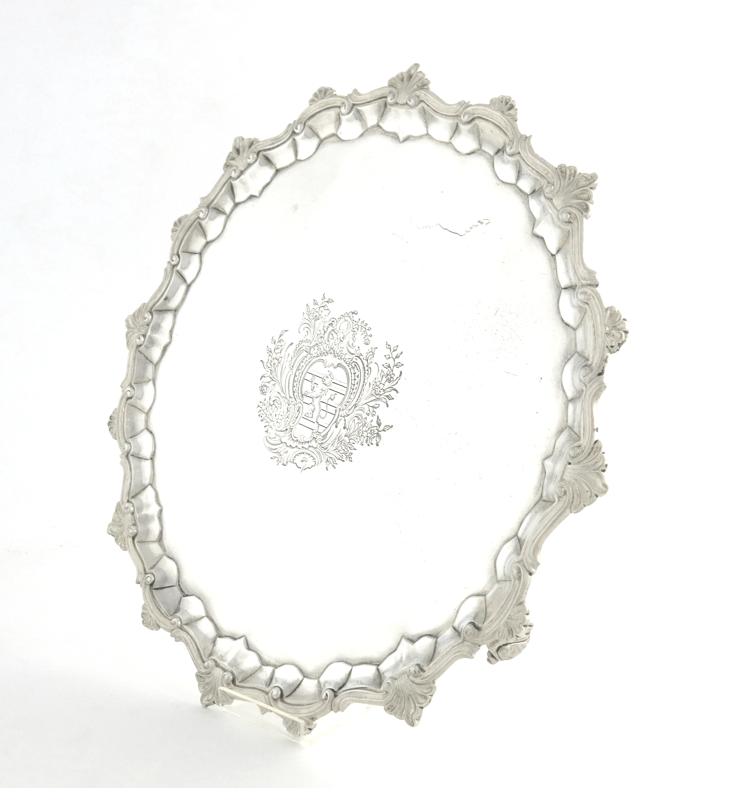 circular form, shell and scroll border, the centre engraved with a crest within foliate scroll mantling, on three gnarl feet, diameter 39cm, approx. weight 48oz.
