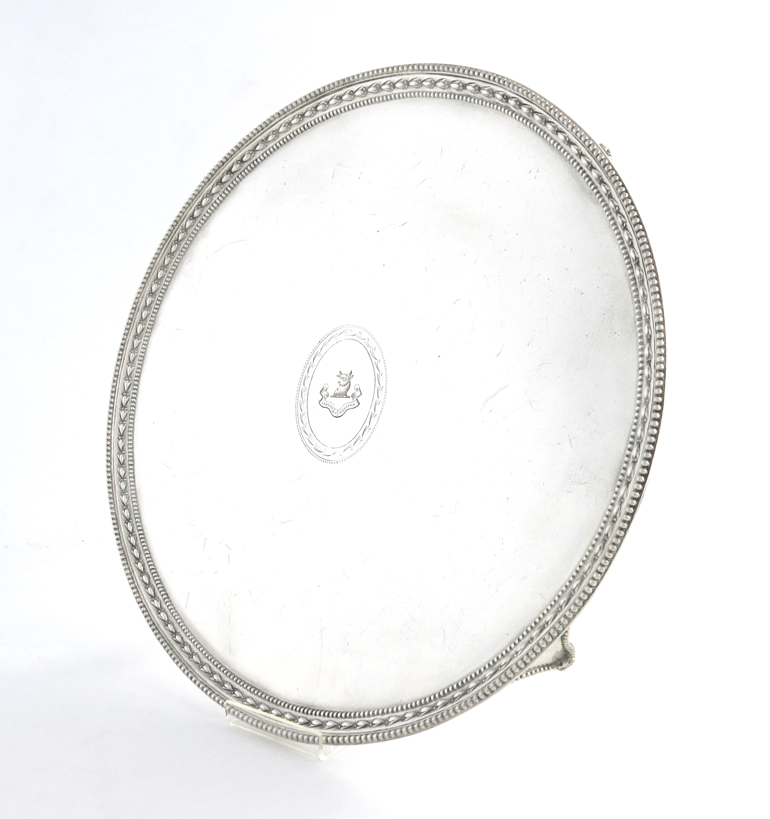 circular form, bead and husk border, the centre engraved with a crest within an oval cartouche, on four beaded bracket feet, diameter 37cm, approx. weight 46oz.