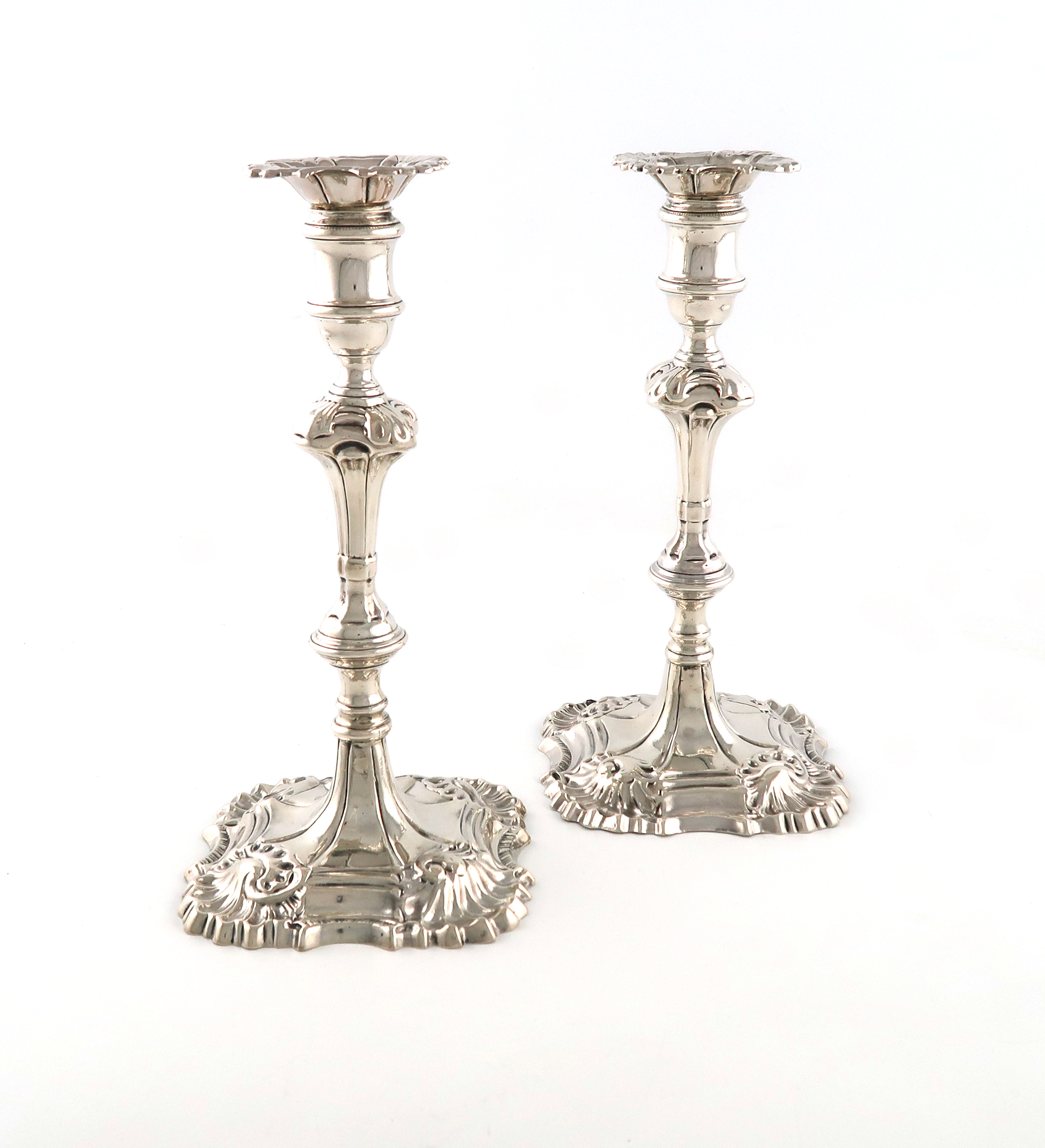 knopped baluster stems, spool-shaped capitals, detachable drip pans, on shaped square bases with shell motifs, height 24.7cm, approx. weight 40oz. (2)