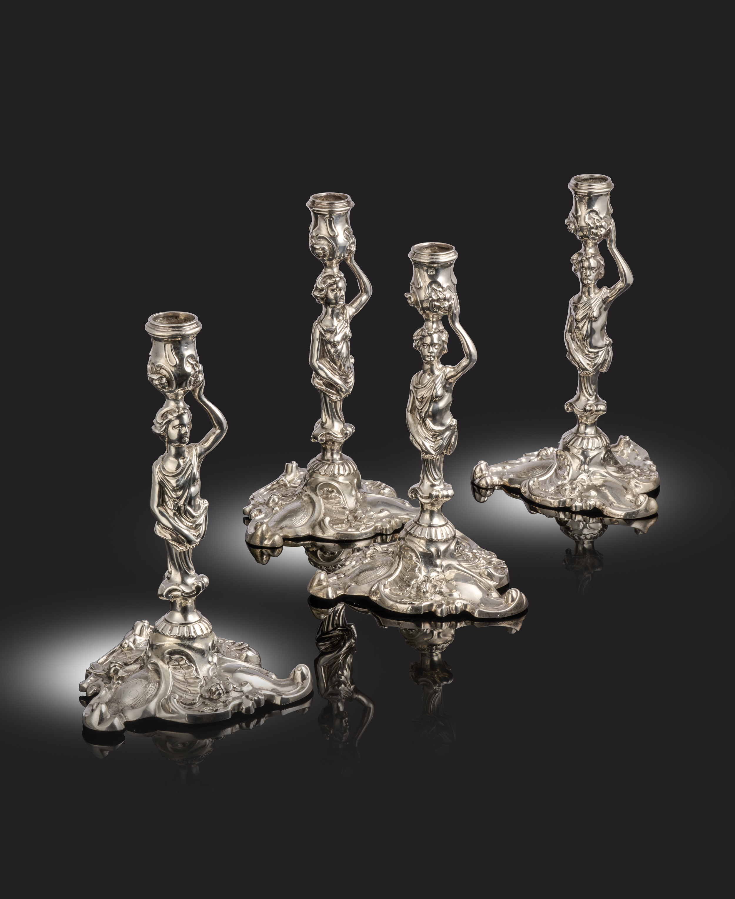 caryatid form, urn shaped capitals with foliate decoration, on triangular bases with foliate scroll decoration, and engraved with an armorial, height 24.7cm, approx. weight 95oz. (4)