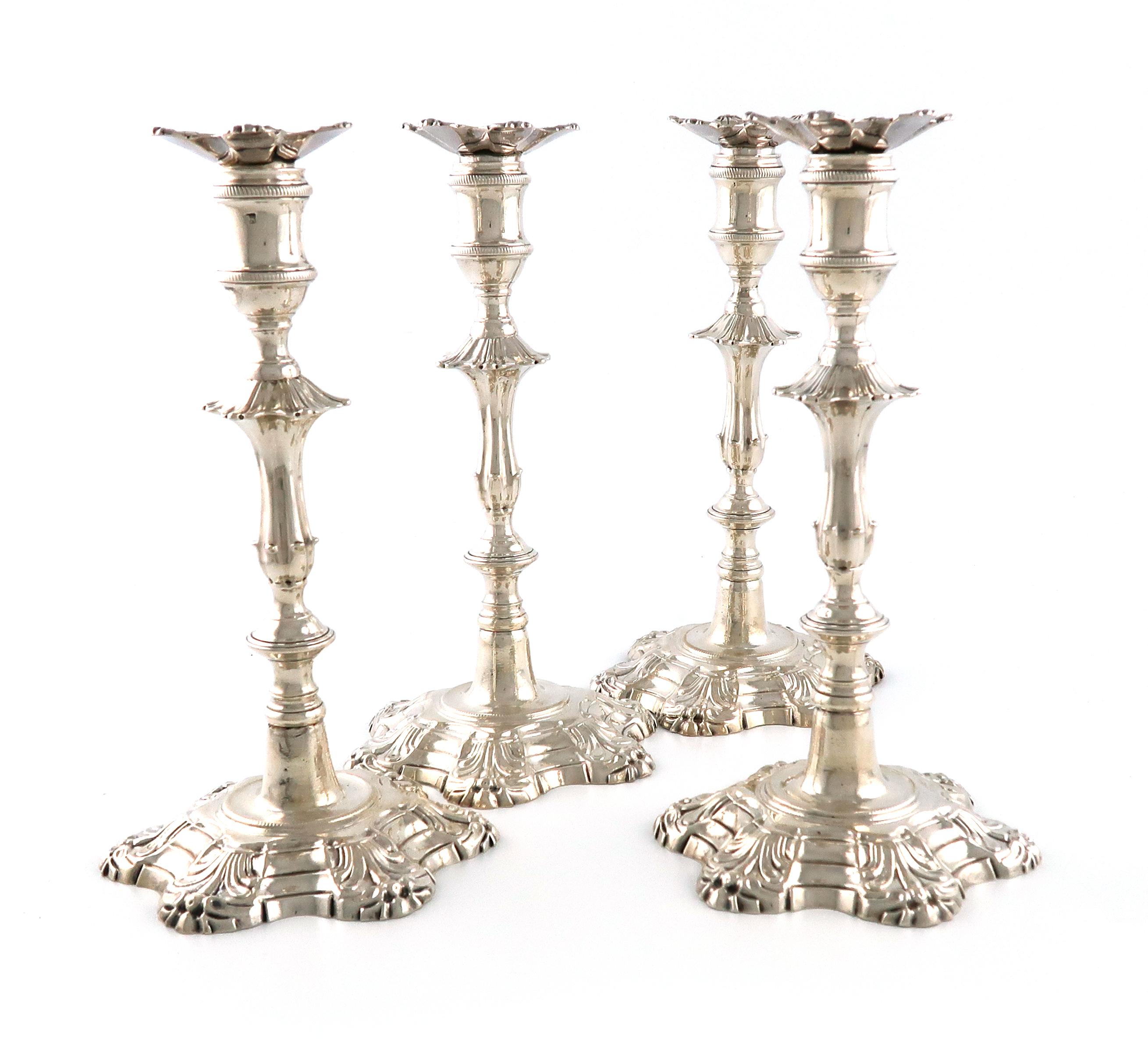 knopped baluster form, shell shoulders, spool-shaped capitals, rope-work borders, removable drip pans, on raised shaped hexafoil bases with shell motifs, height 24.8cm, approx. weight 82oz. (4)