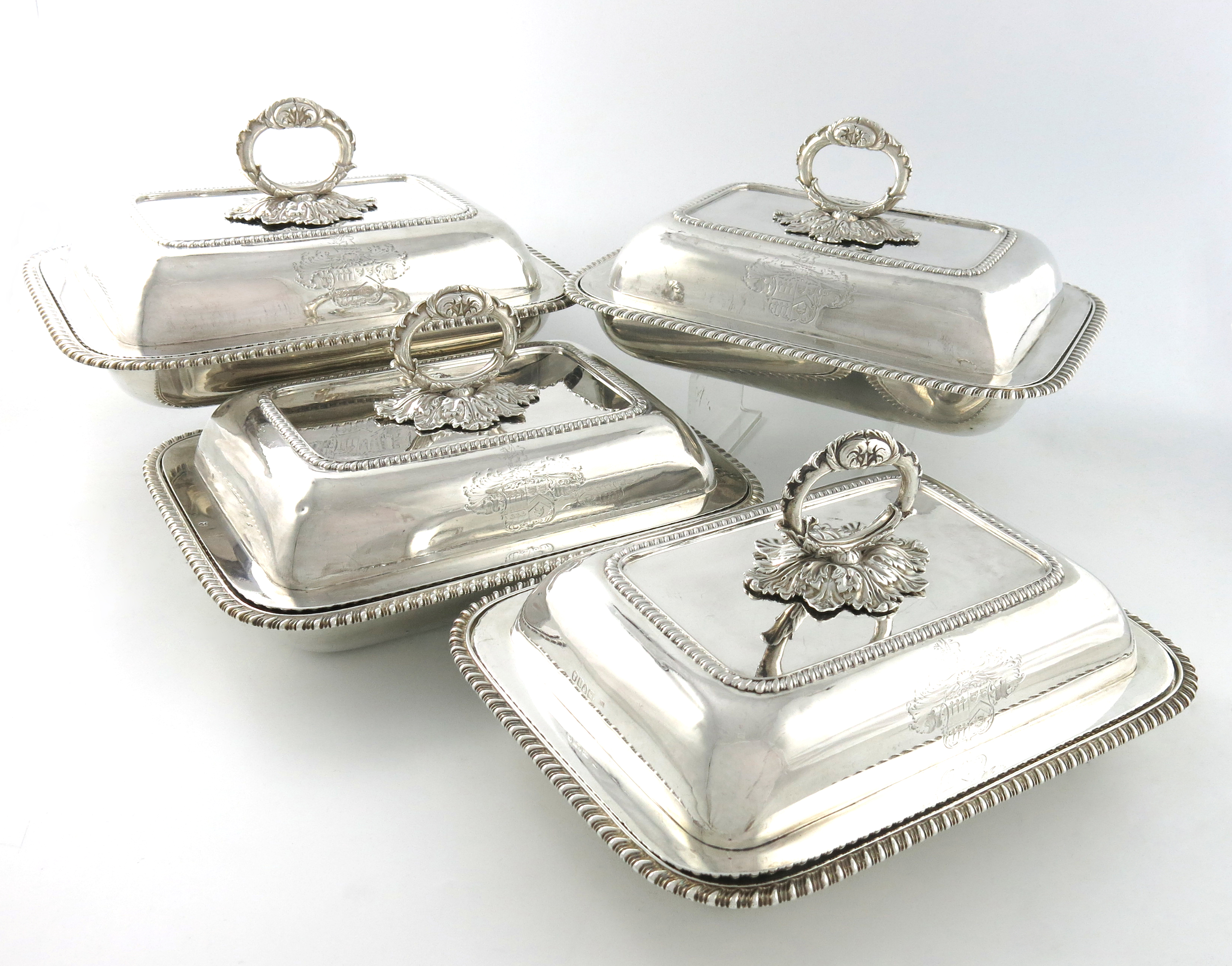 rectangular form, gadroon borders, detachable foliate handles, the covers engraved with an armorial with foliate mantling, the bases with a crest, numbered 1-4, length 31cm, approx. weight 253oz. (4)