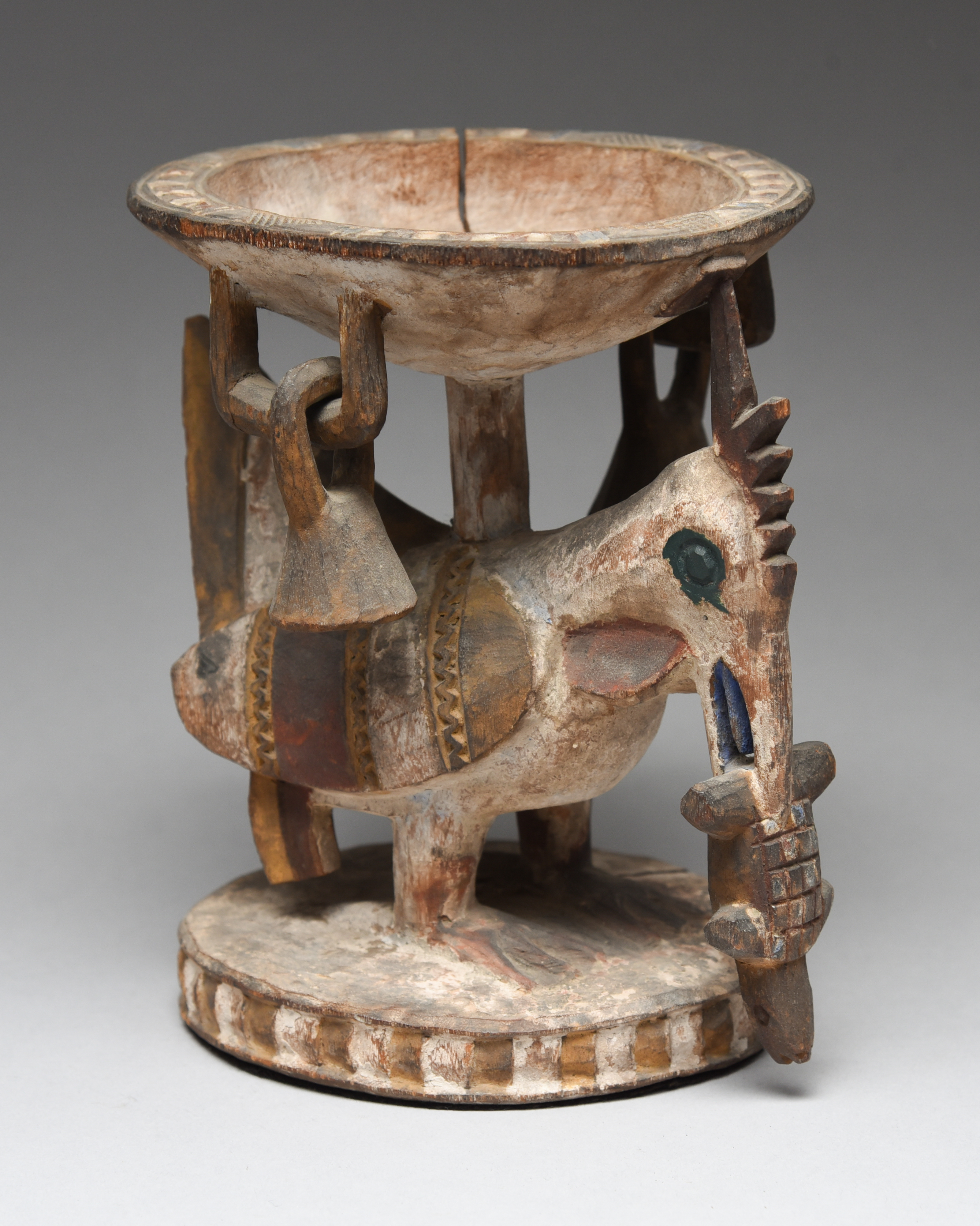 the bowl with two hanging bells and supported by a cockerel with a tortoise in its beak, with red, white and blue pigment,