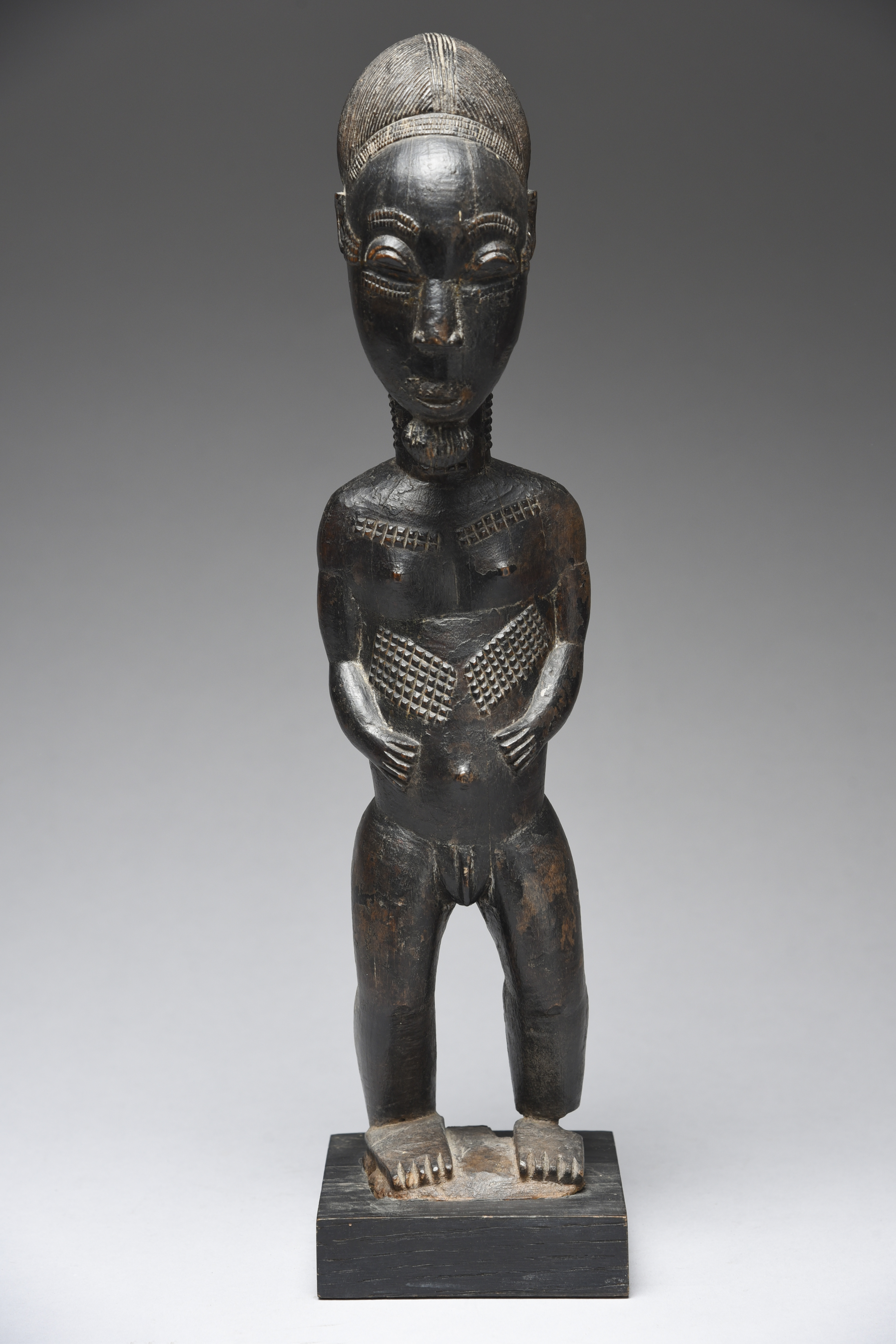 with a fine linear carved coiffure and short beard and with scarifications to the face, neck and torso, with his hands placed on his abdomen and with bent knees,