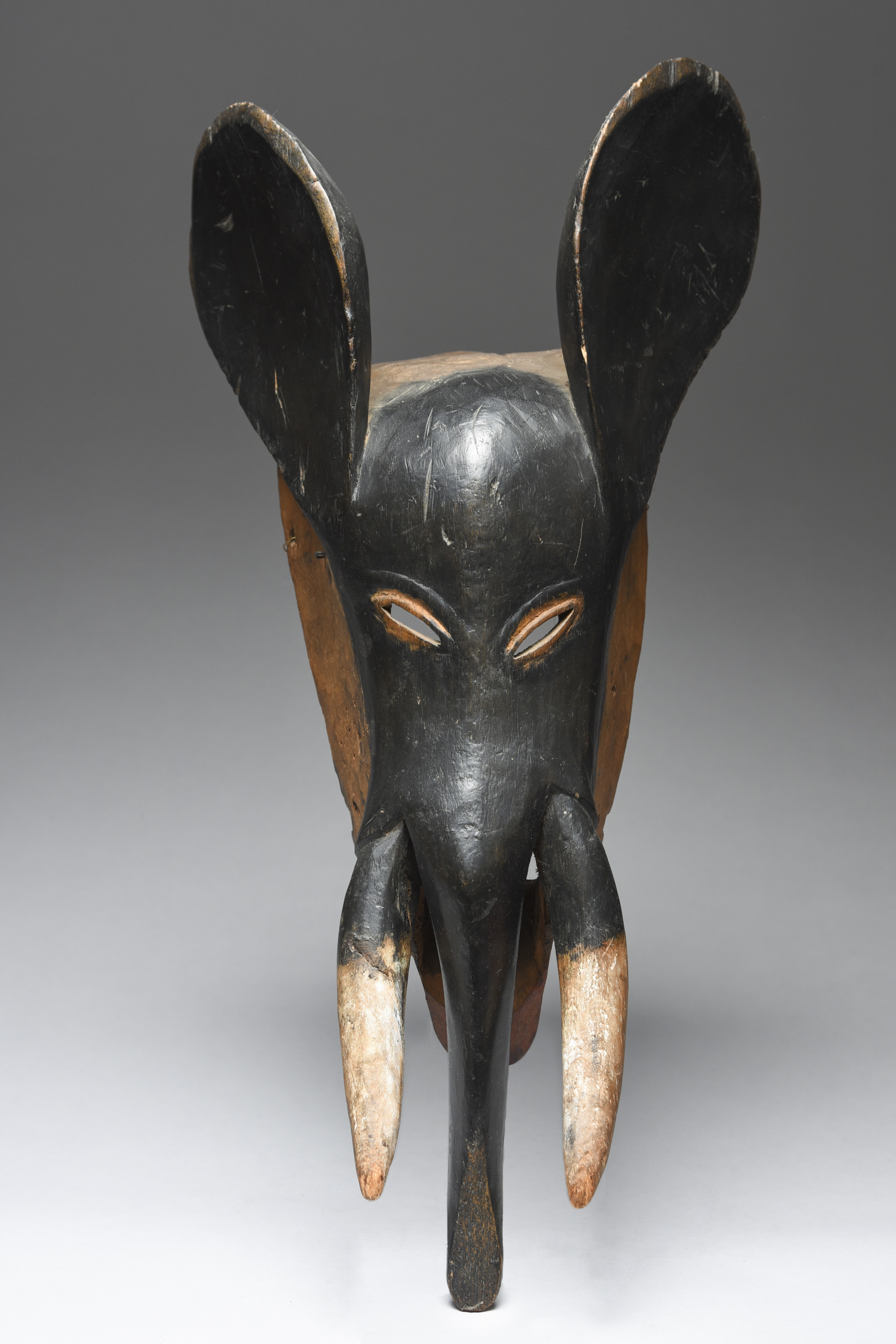with a large pair of ears, a trunk and a pair of tusks with pierced eyes, having black, white and red pigment, the back notched for a mouth bar,