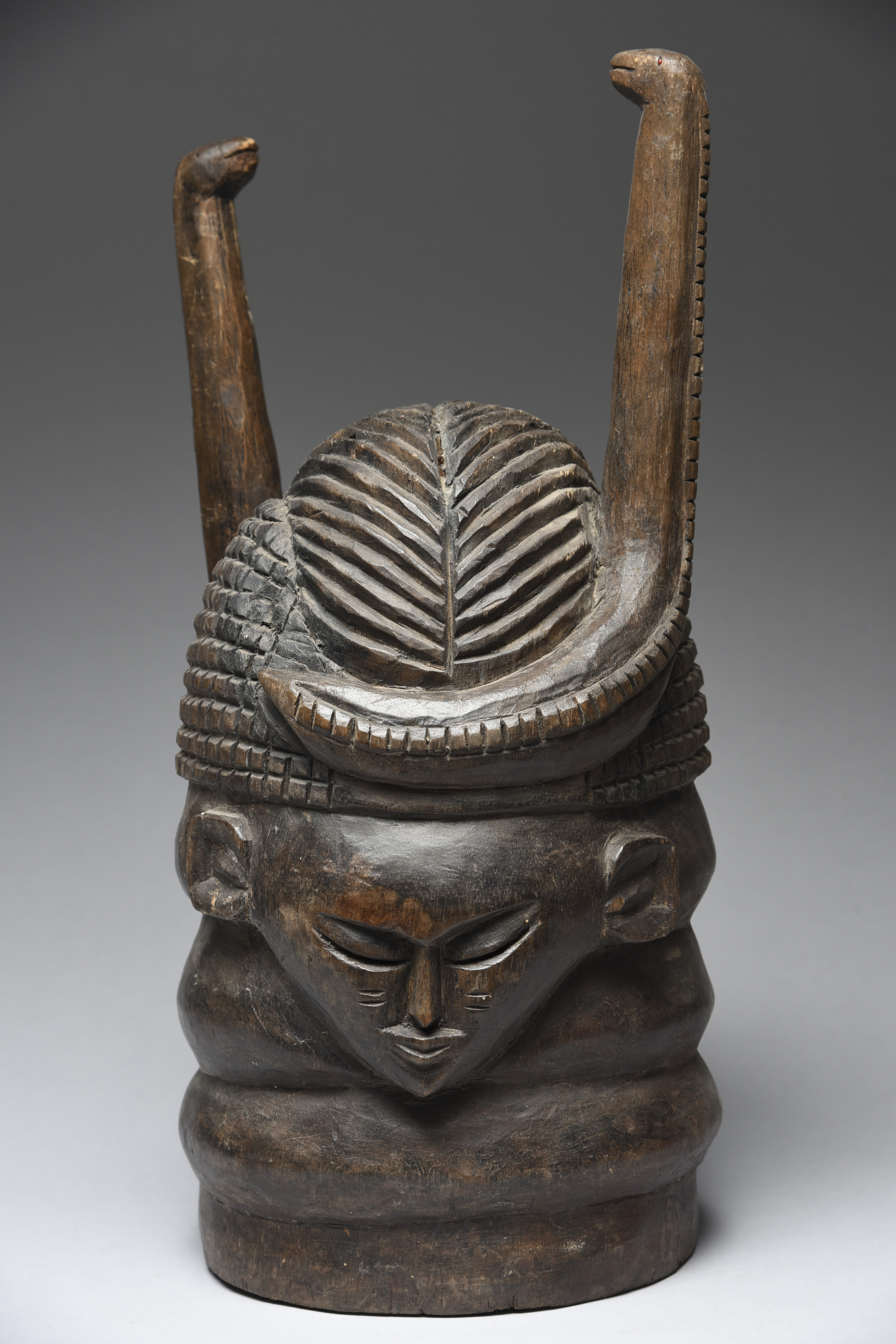 janiform with pierced eyes and snakes rising from the coiffure with glass bead eyes,