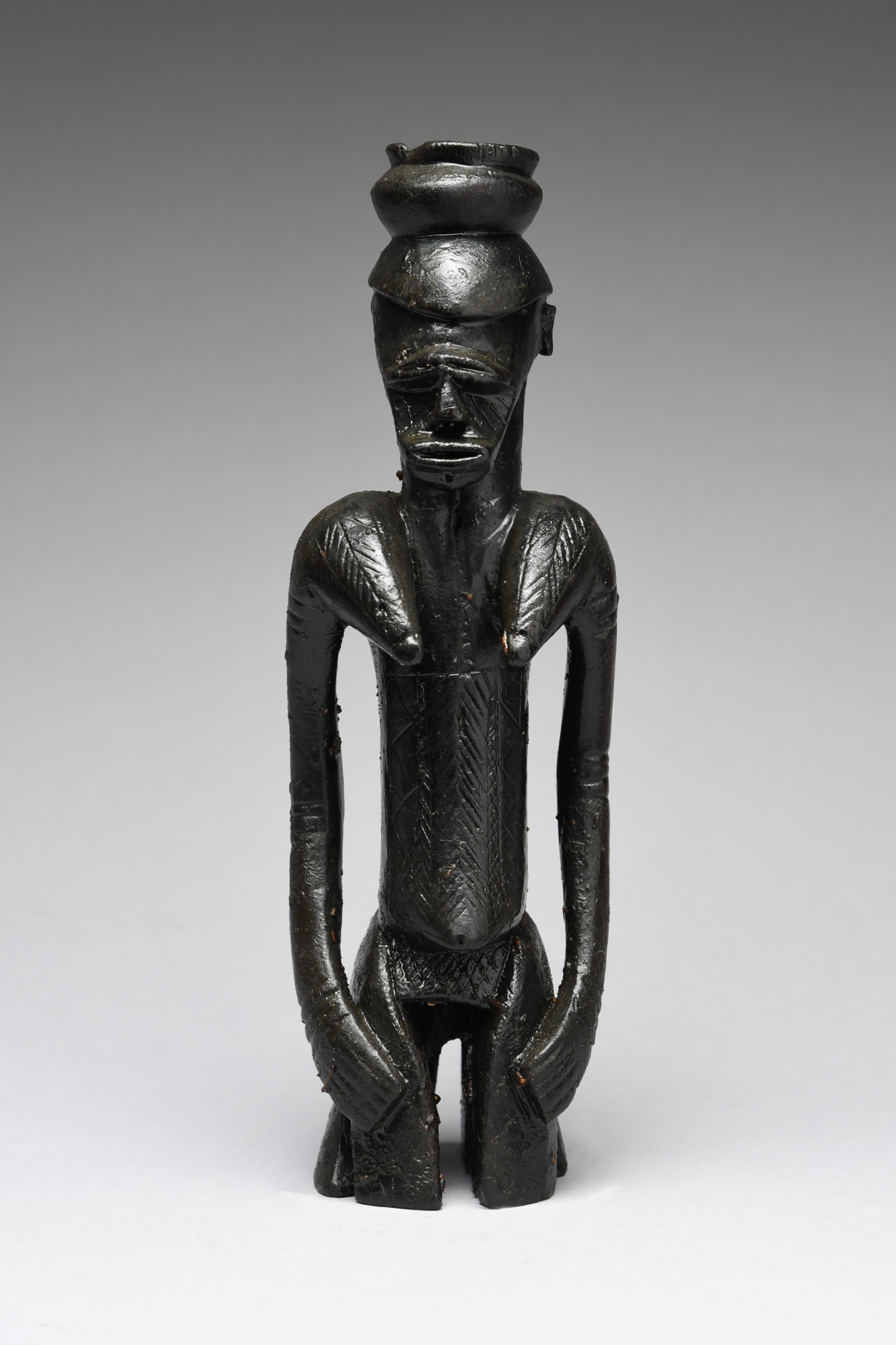 seated with a small bowl on her head, with facial and body scarifications and with her hands resting of her thighs, with a thick oiled patina,