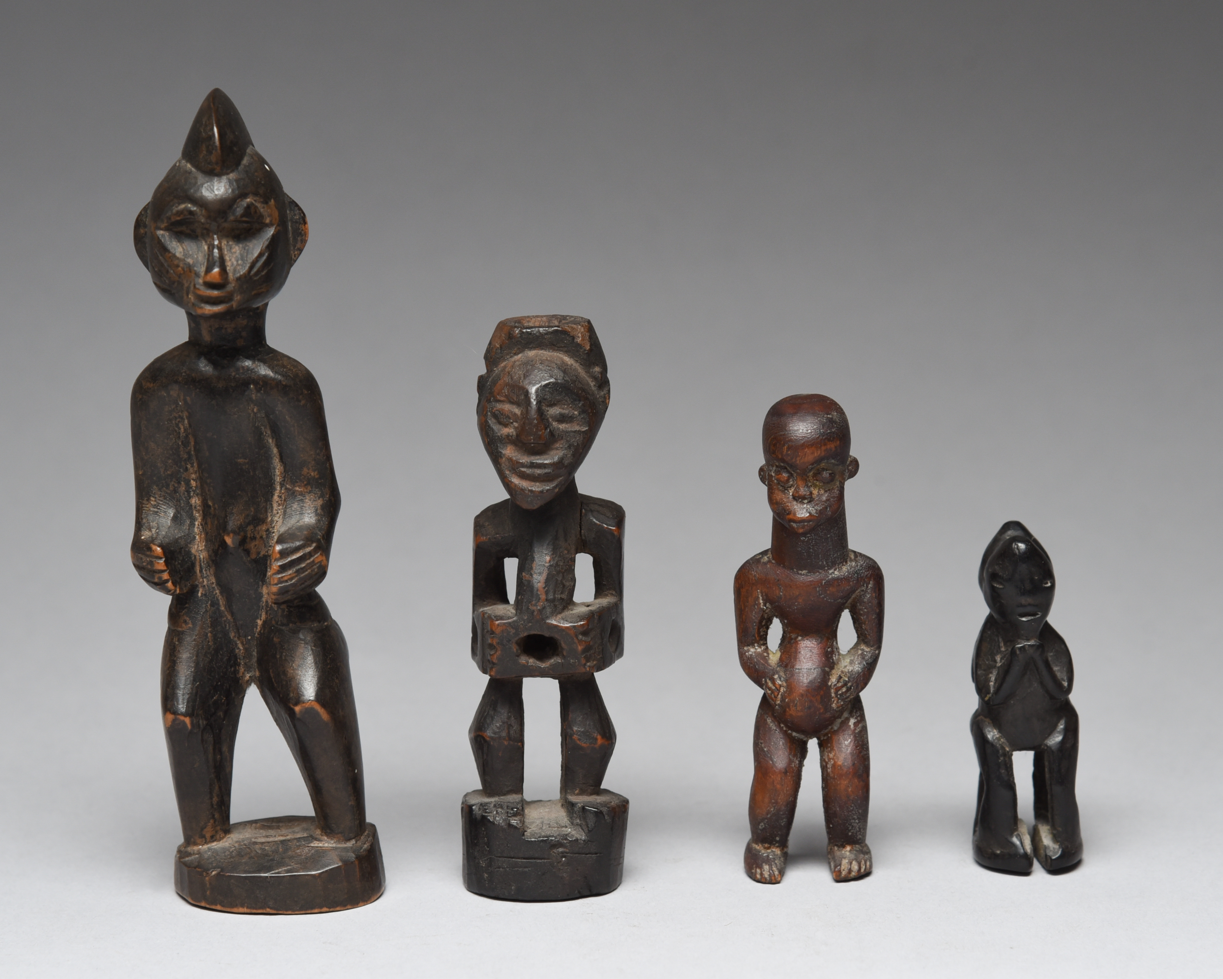 a Senufo miniature figure, 16.5cm high, a Congo miniature janus figure group, 7cm high and West Africa miniature standing figure, 10cm high. (4)