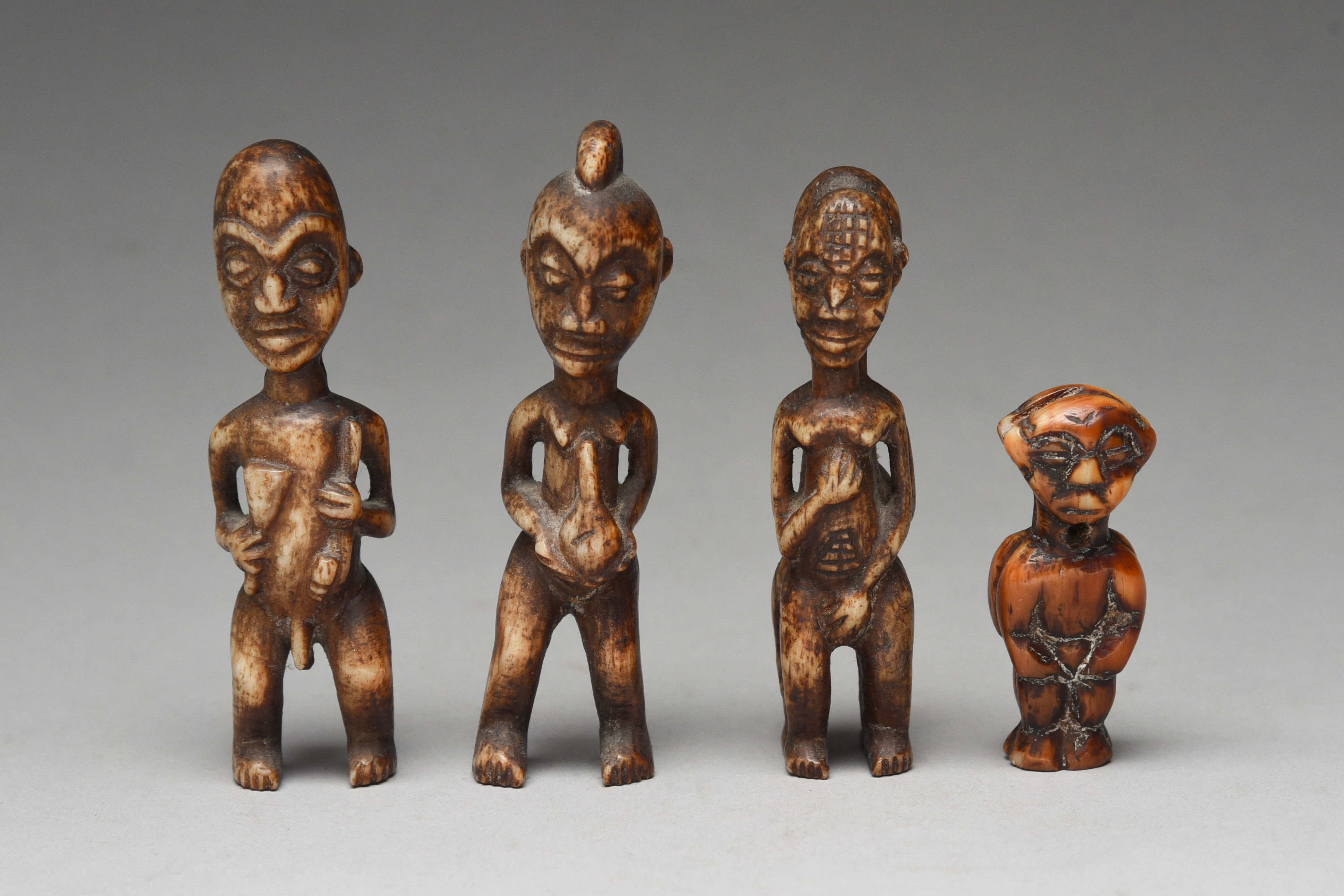 and a pair of Cameroon carved bone female and male figure amulets, 10cm and 9.7cm high and a Cameroon carved bone male and female janus amulet, 9cm high. (4)